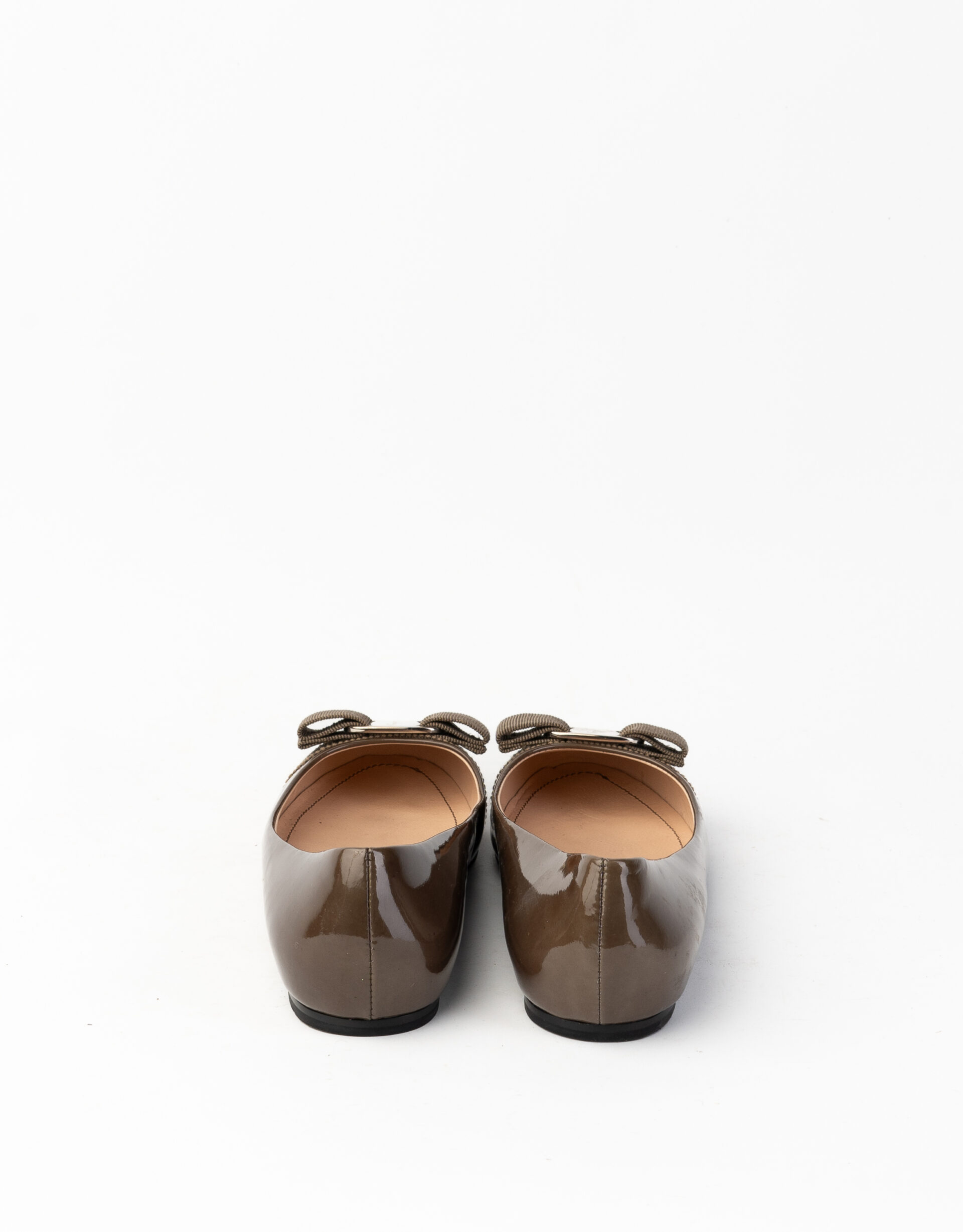 Ballerina in vernice metallizzata sasso, modello Varina con l'iconico fiocco, a punta tonda. Fodera in pelle biscotto. Suola flat in cuoio nero con logo impresso.