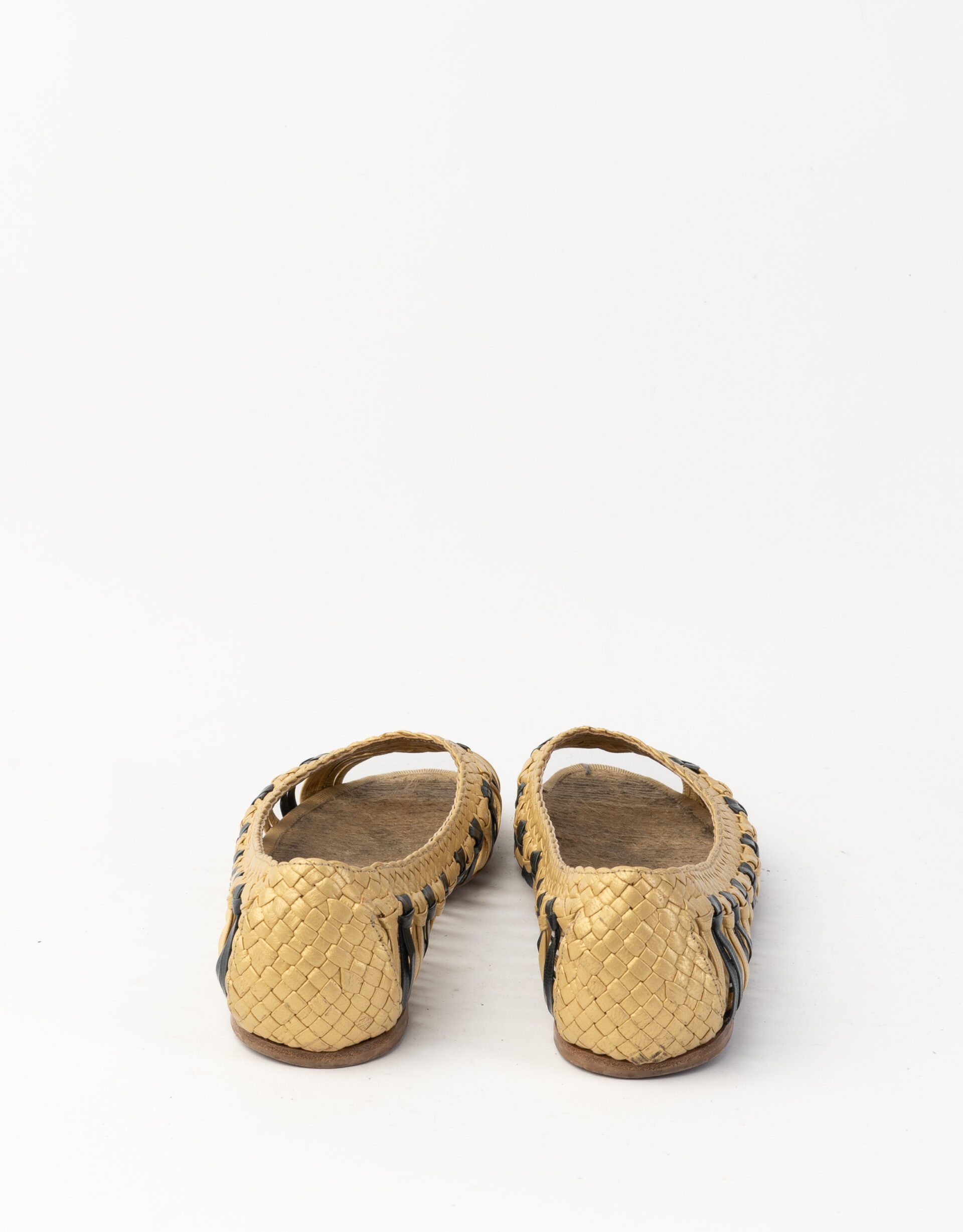 Ballerina in pelle metallizzata oro e blu oltremare, spuntata. Sfoderata con soletta in corda. Suola flat in cuoio naturale con logo impresso.