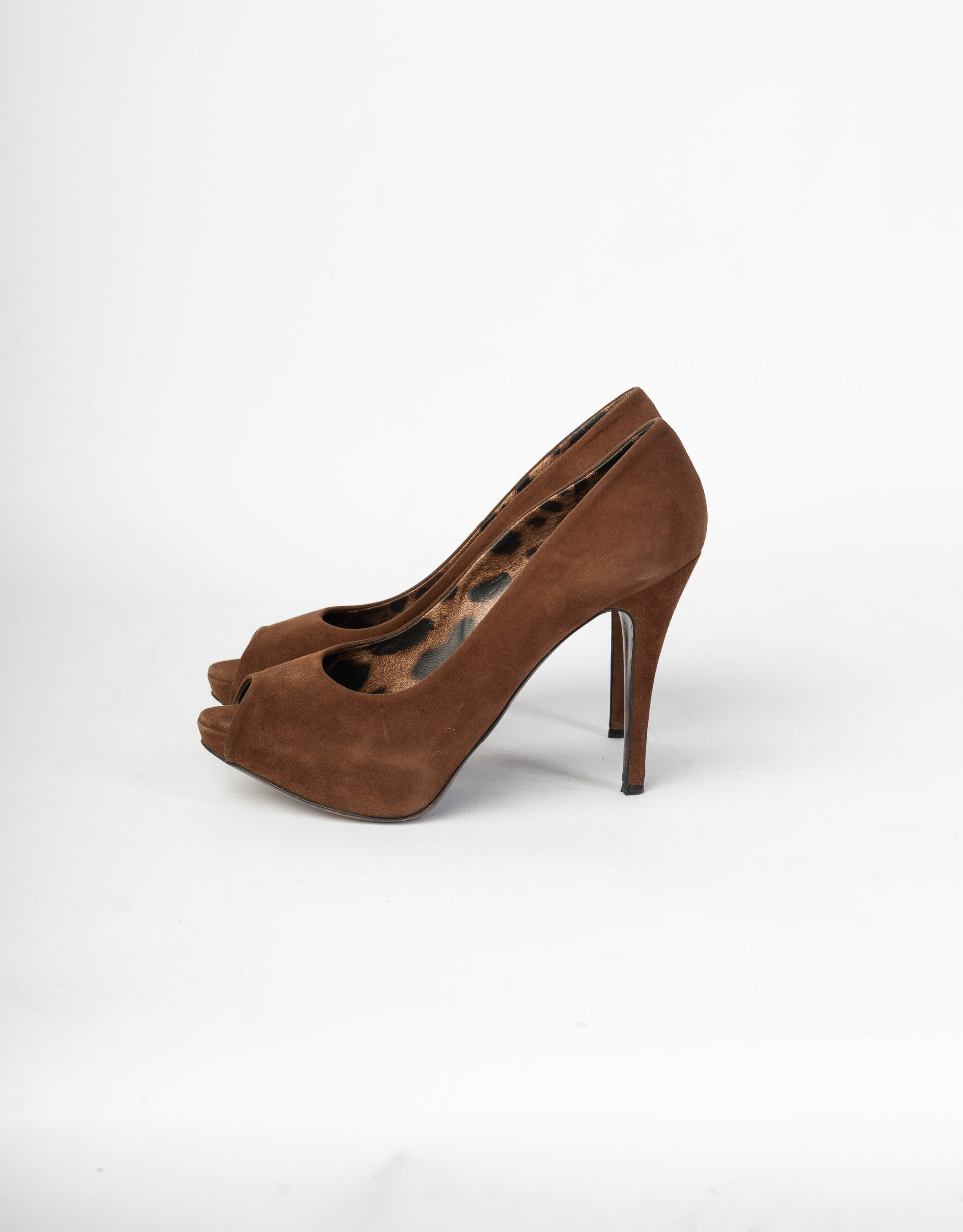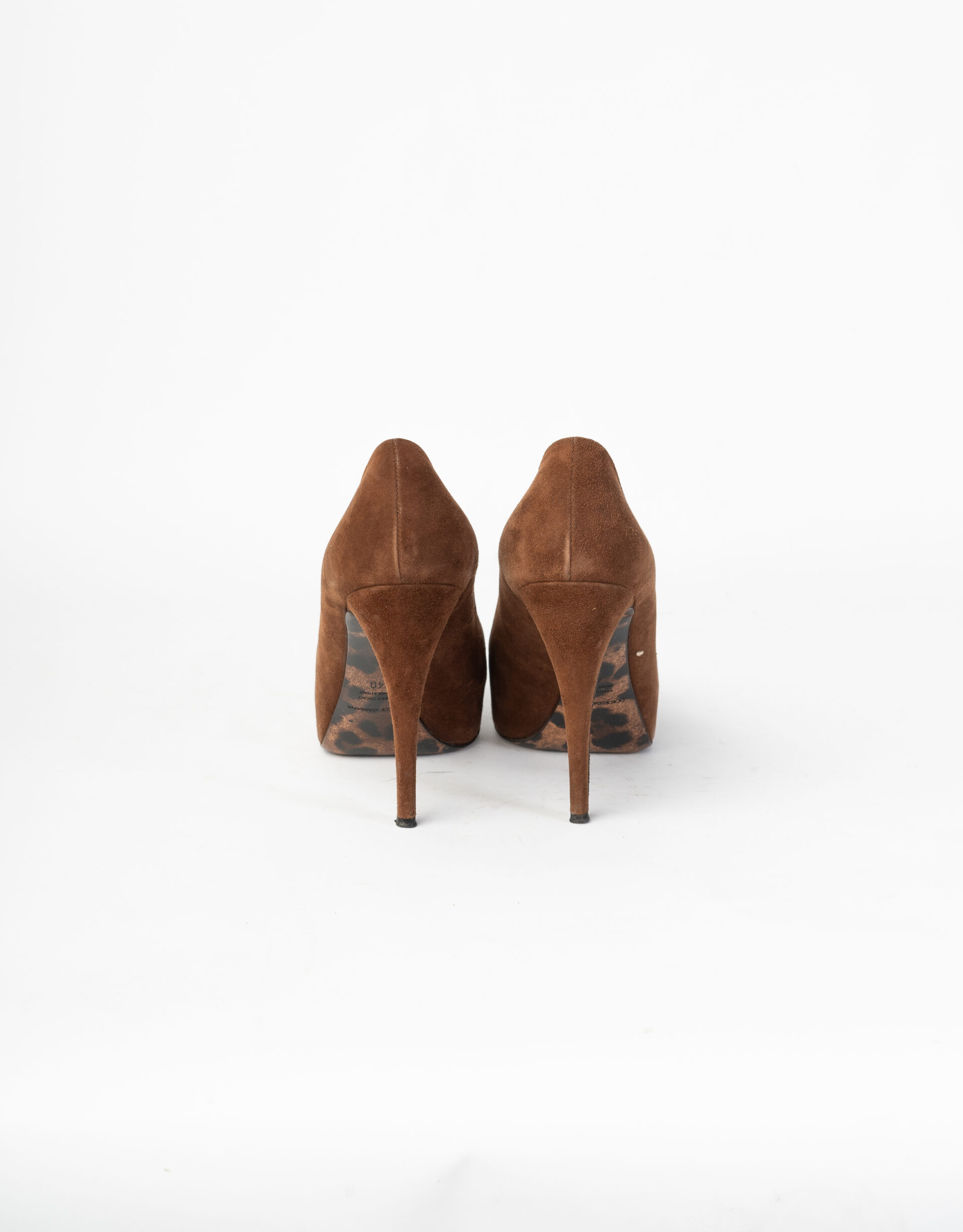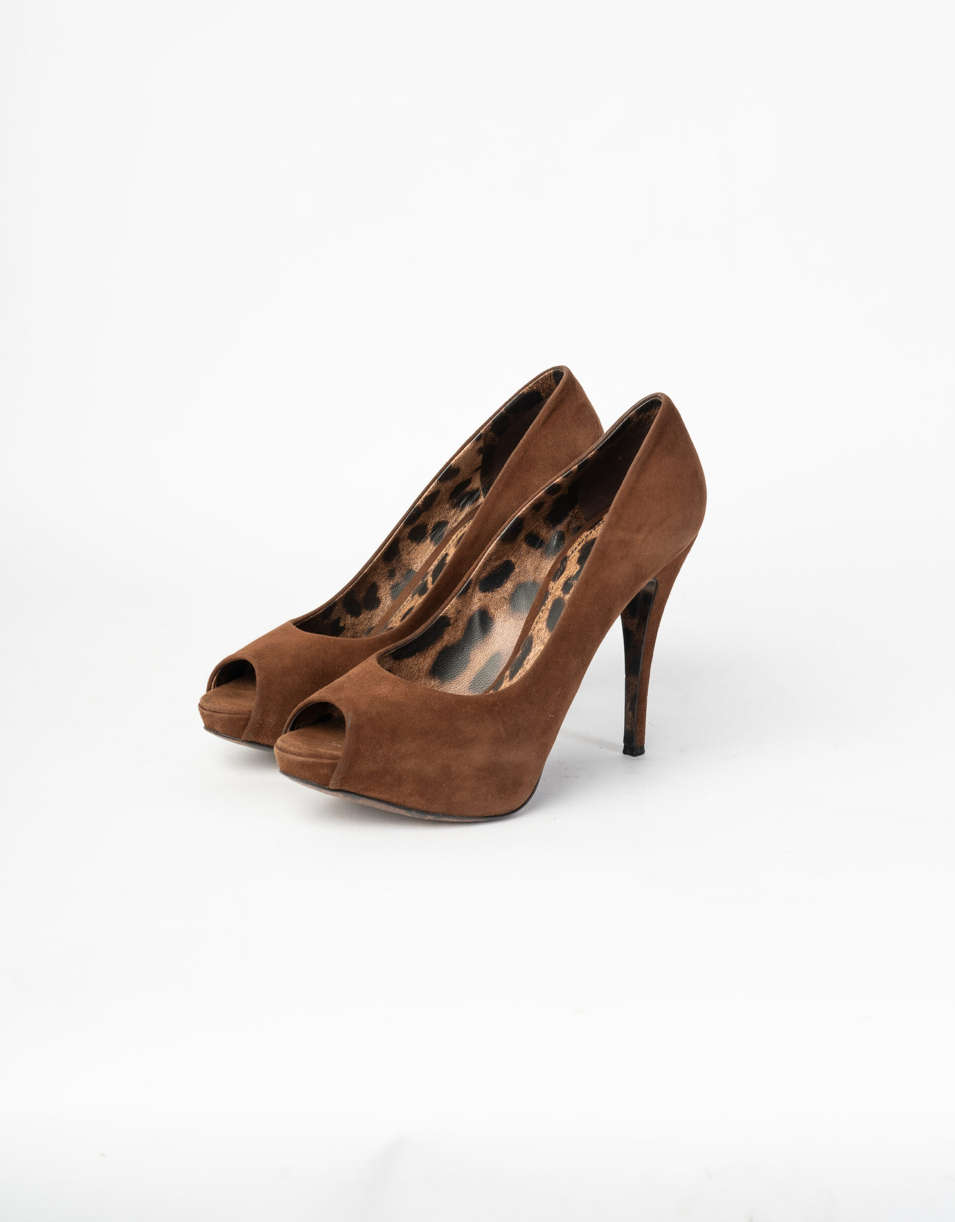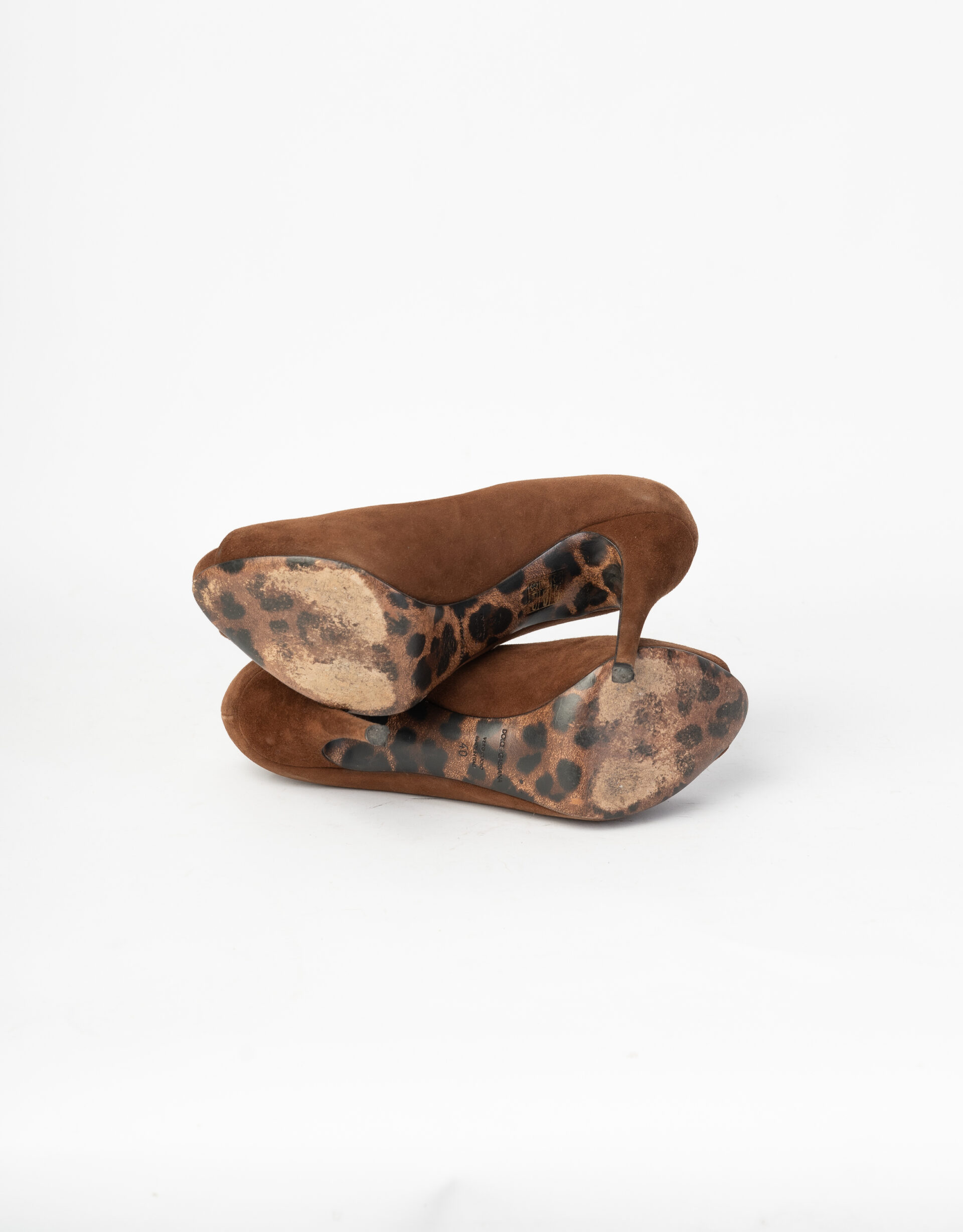 Decolletè in camoscio cacao spuntata con plateu interno. Fodera in pelle stampa leopardo. H tacco 110 mm, H plateau 25 mm. Tacco a spillo fasciato in camoscio. Suola a rondine in cuoio stampa leopardo con logo impresso.