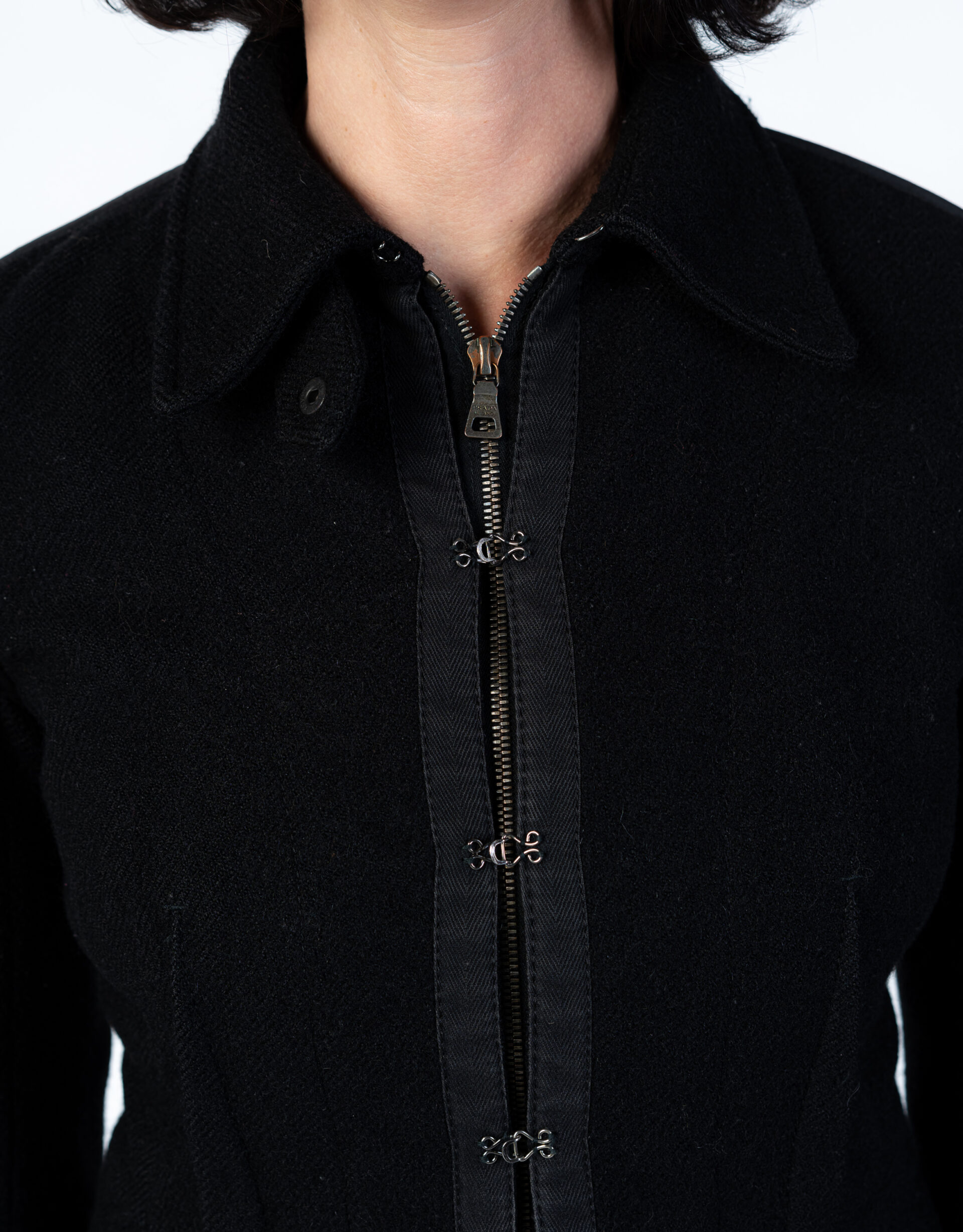 Caldo giacchetto Prada con interno leggermente imbottito ed esterno in morbida lana. Doppia chiusura con zip e ganci