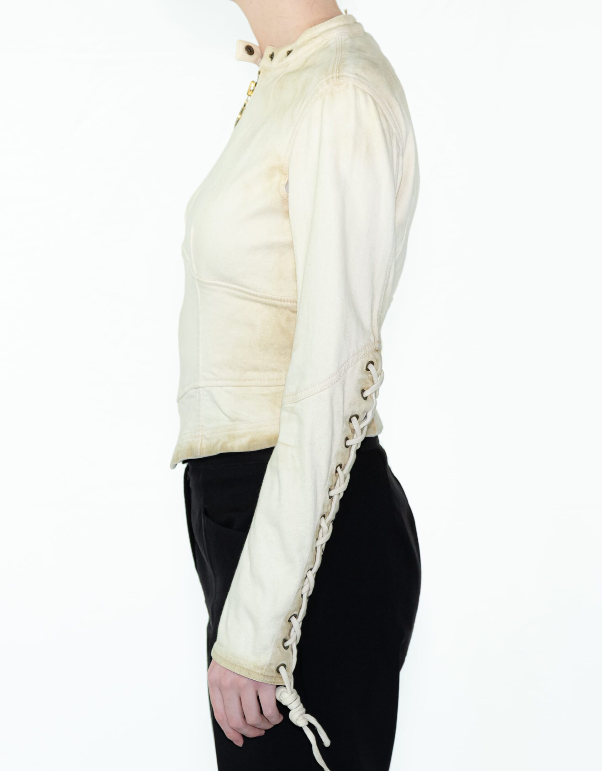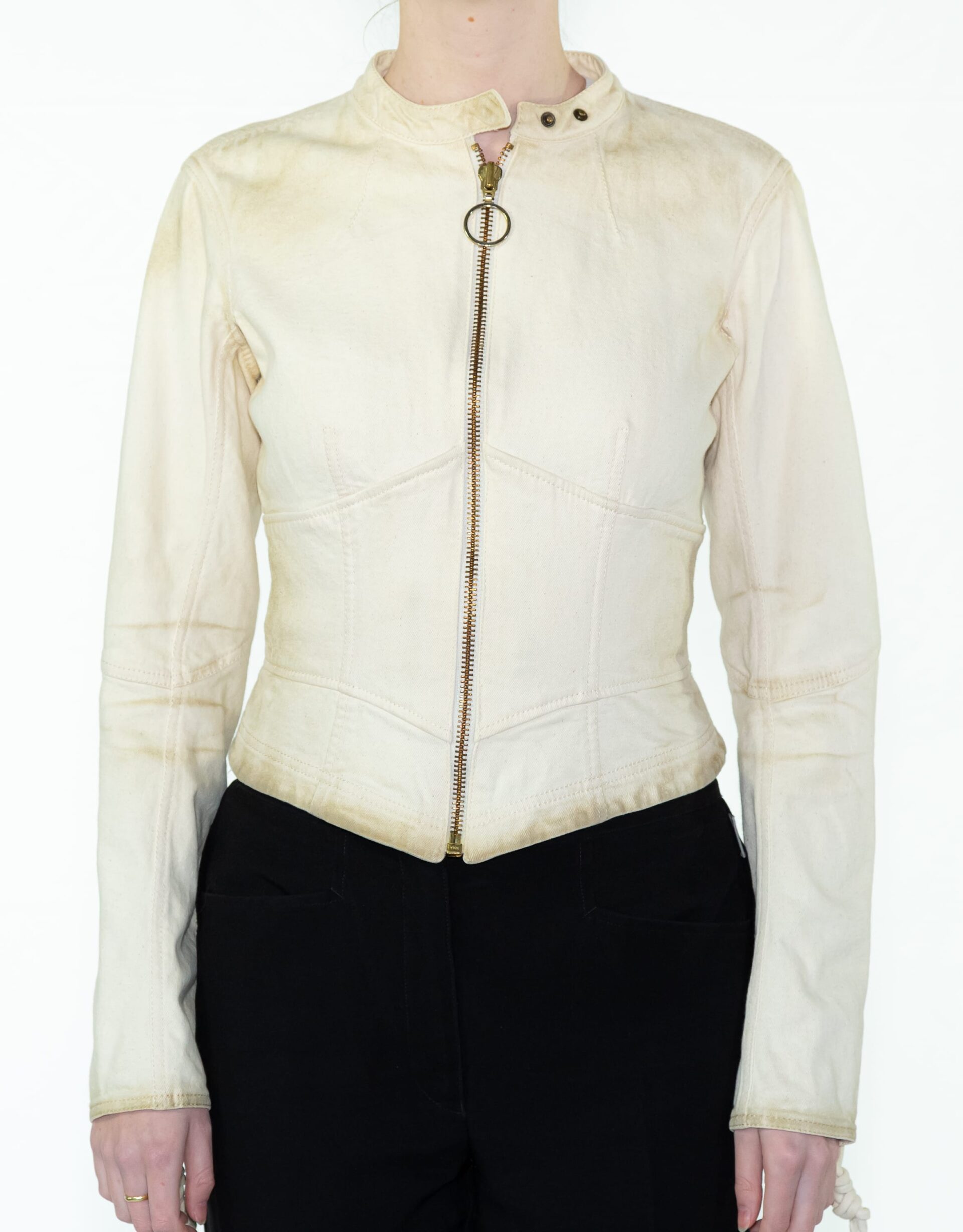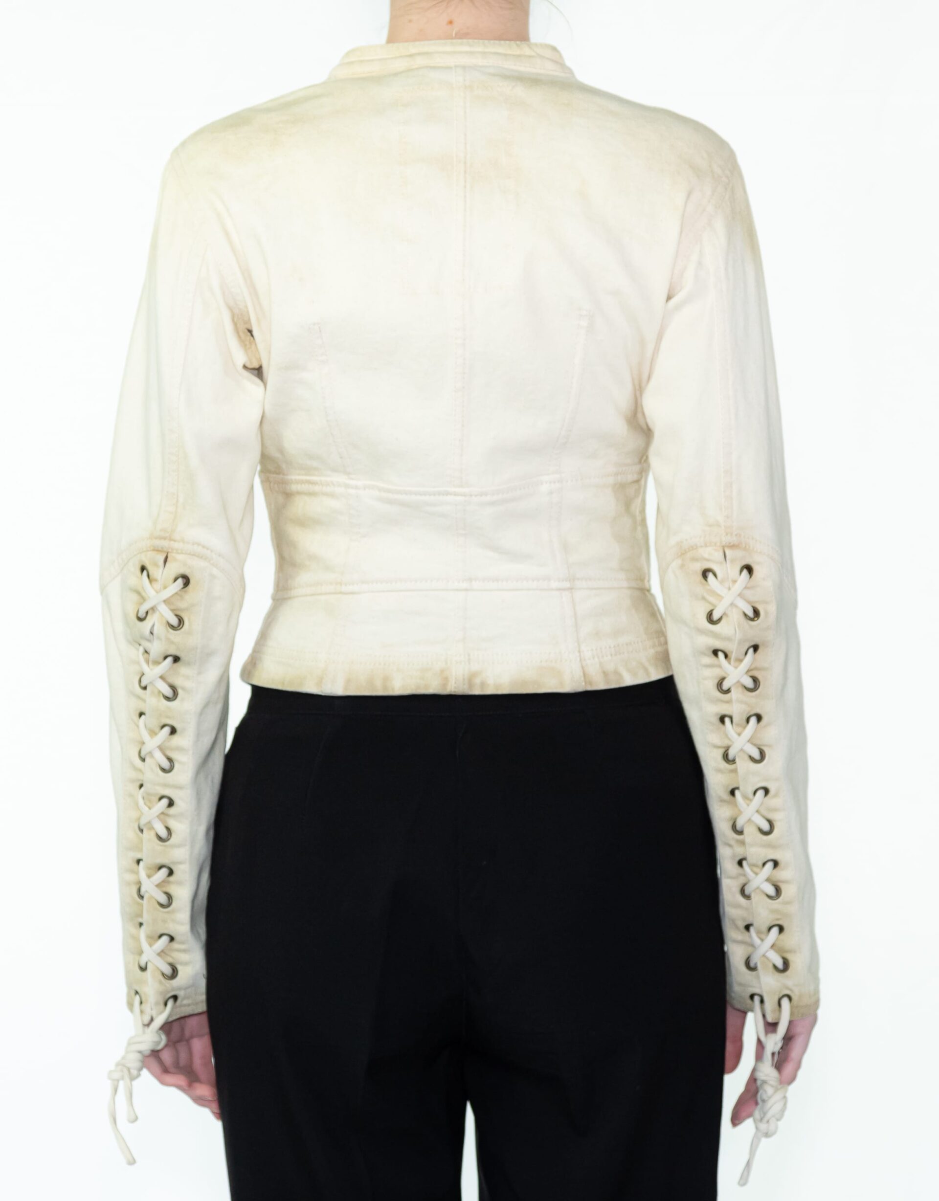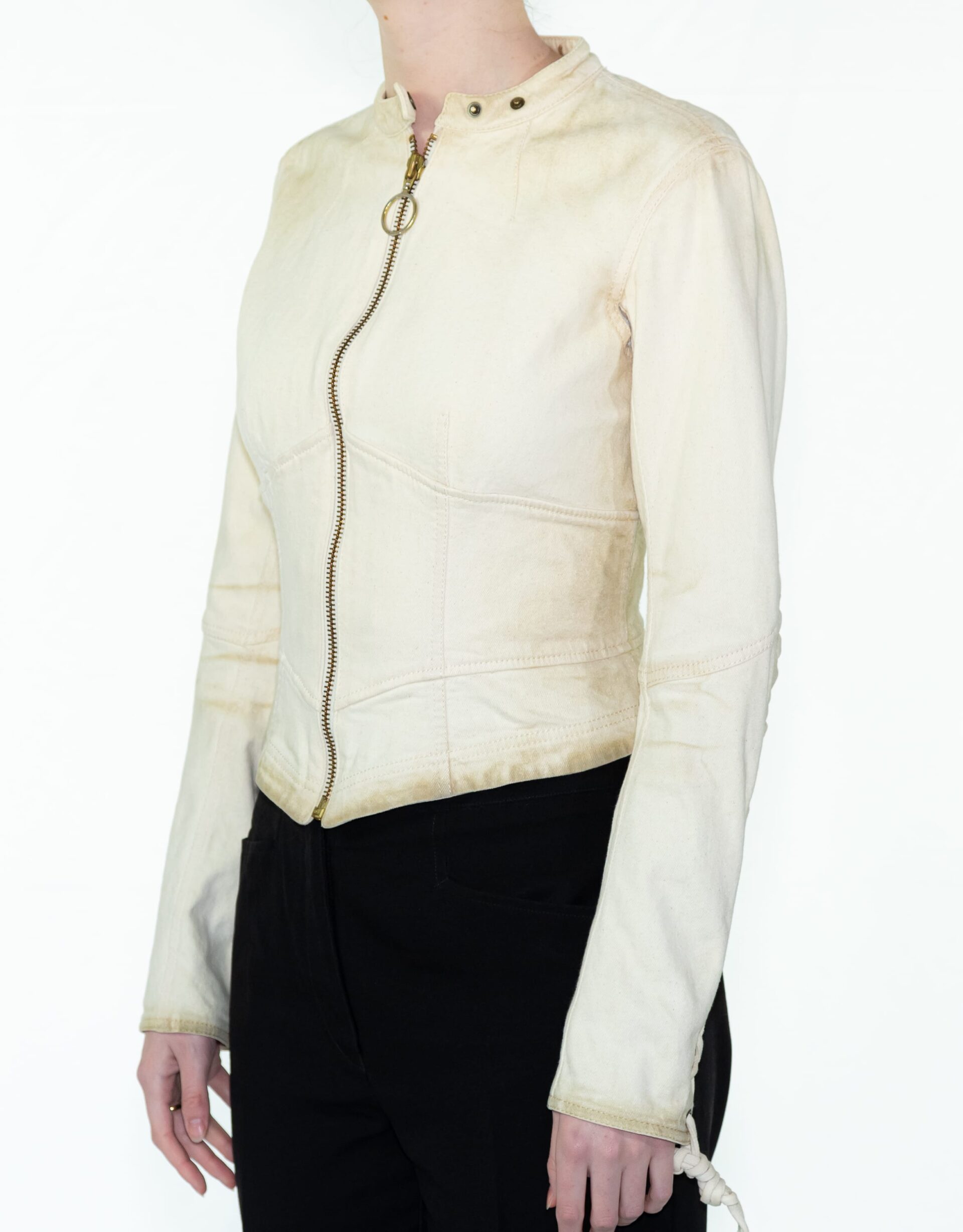 Giacchettino in jeans di Prada con lavaggio effetto vintage. Aperture areazione ascelle. Intrecci sulle maniche. Chiusura con zip. Vestibilità attillata