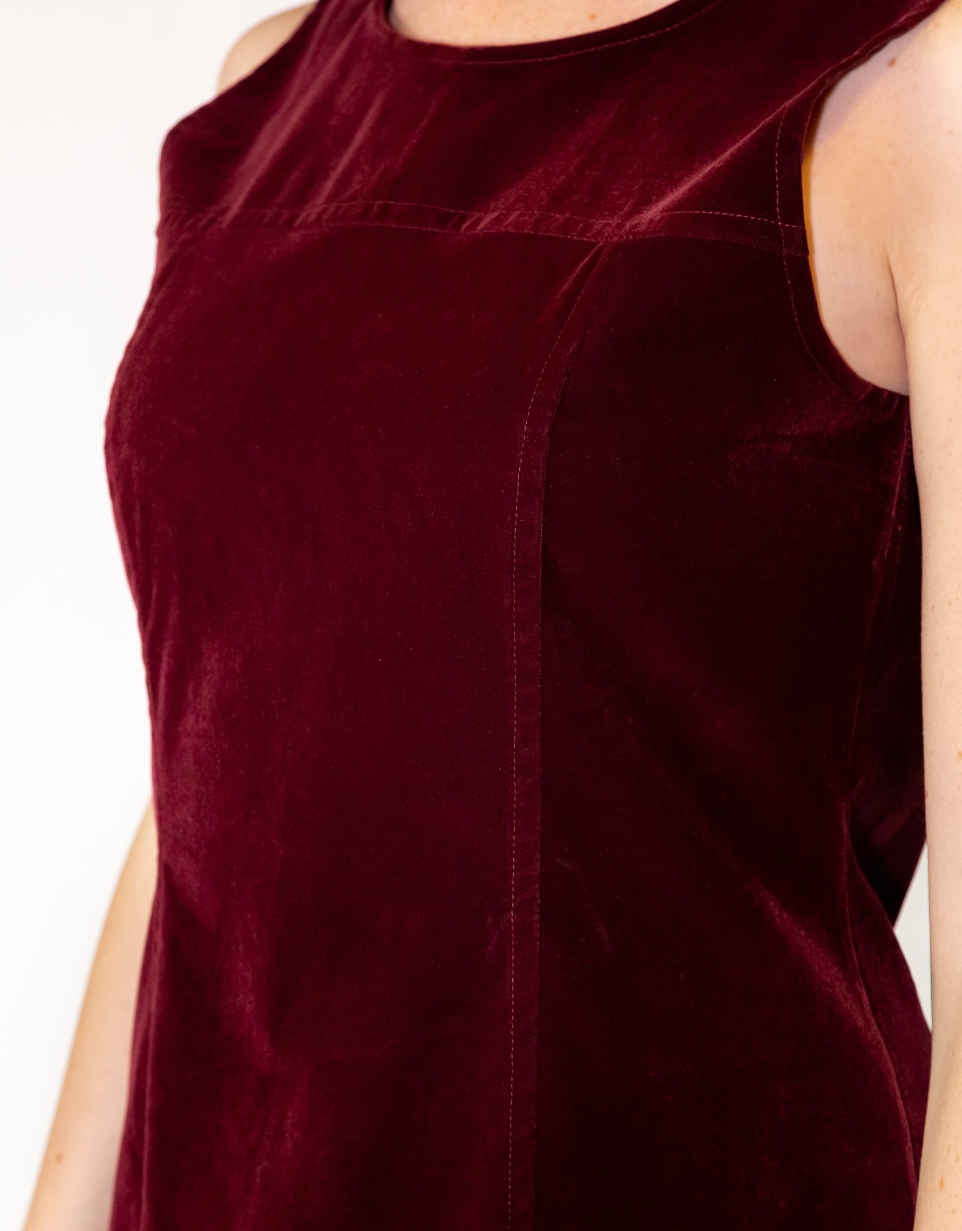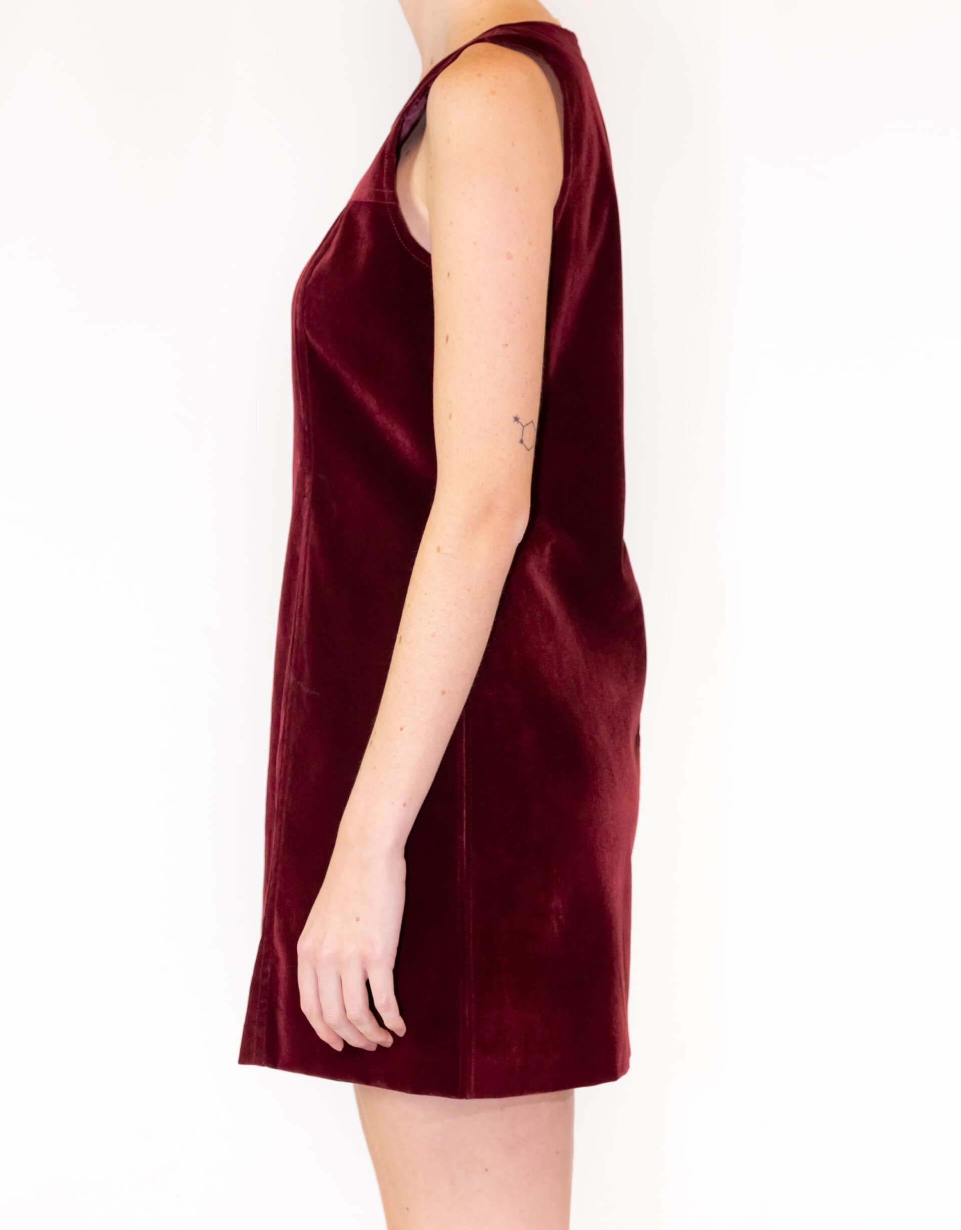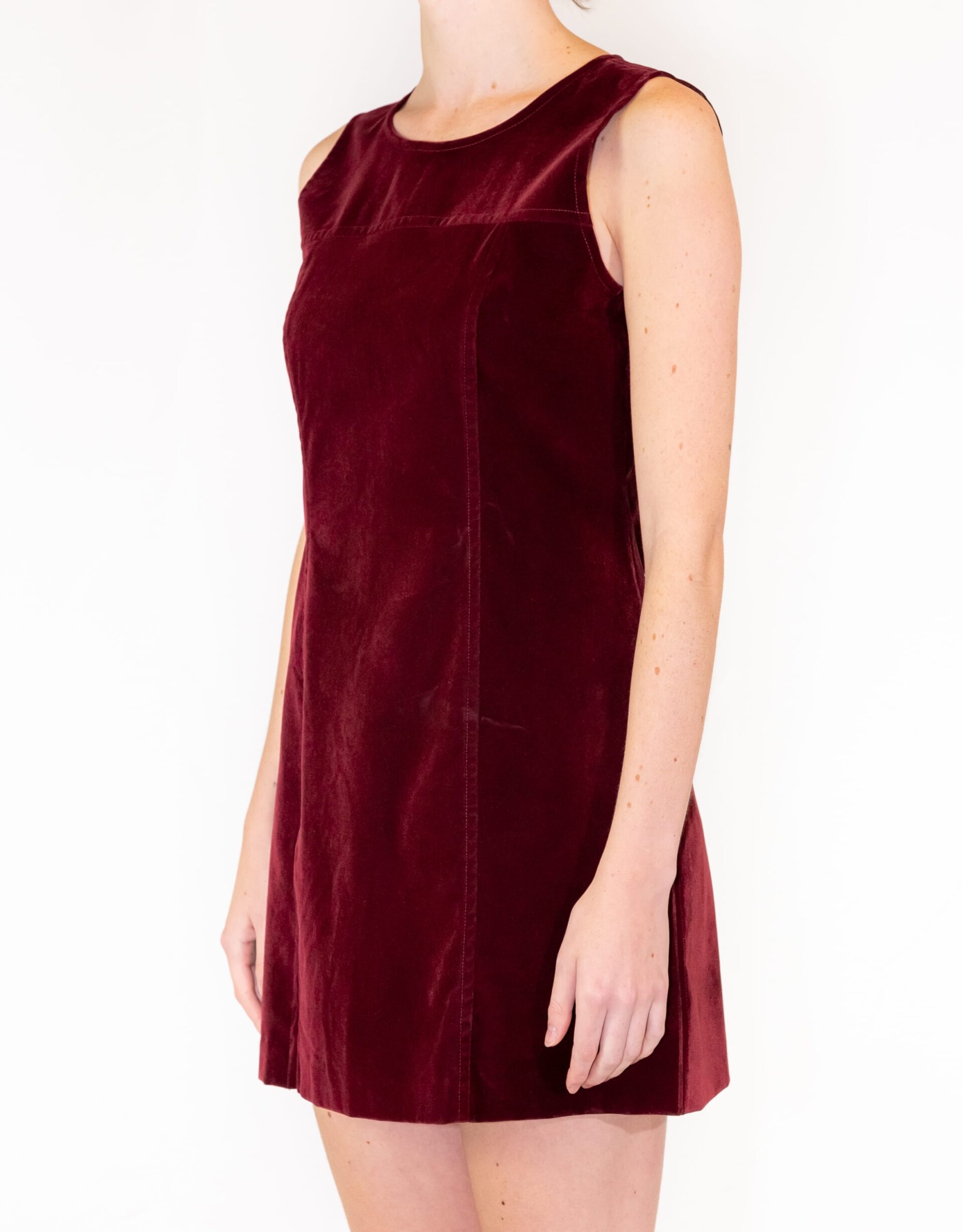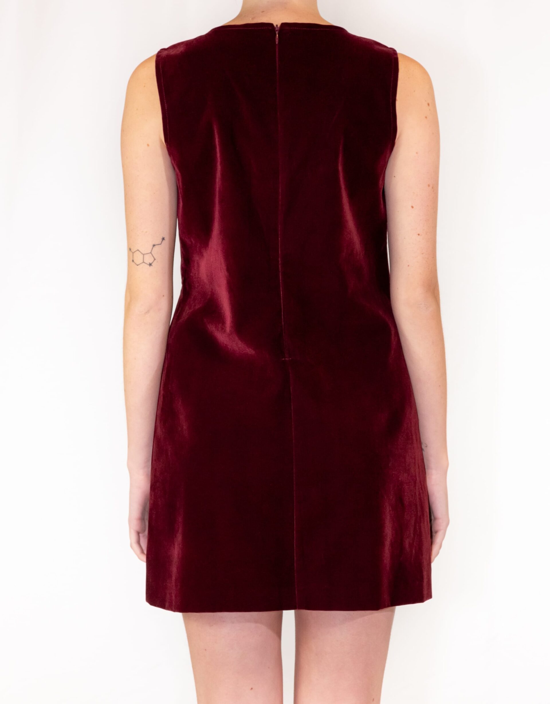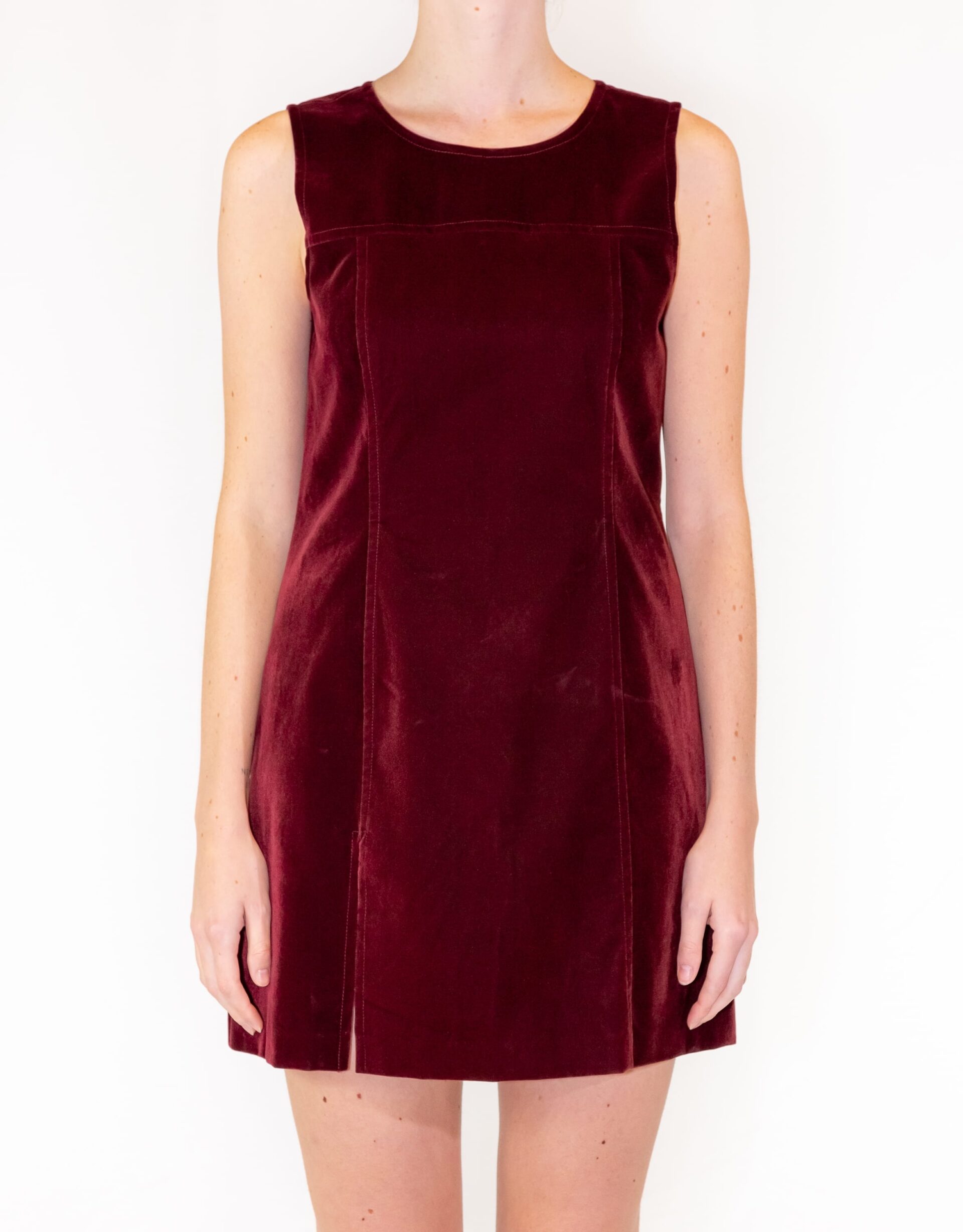 Abito in velluto lughezza sopra al ginocchio, due spacchi sul davanti, spalla larga. Cerniera sul retro, vestibilità dritta