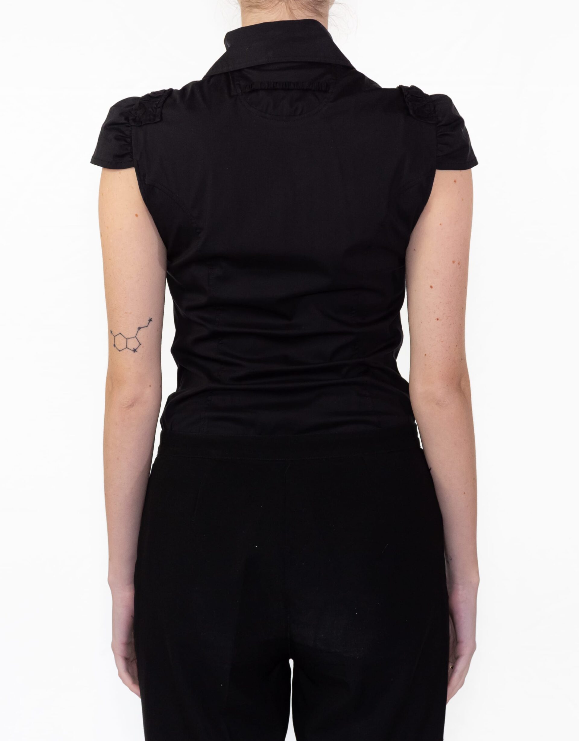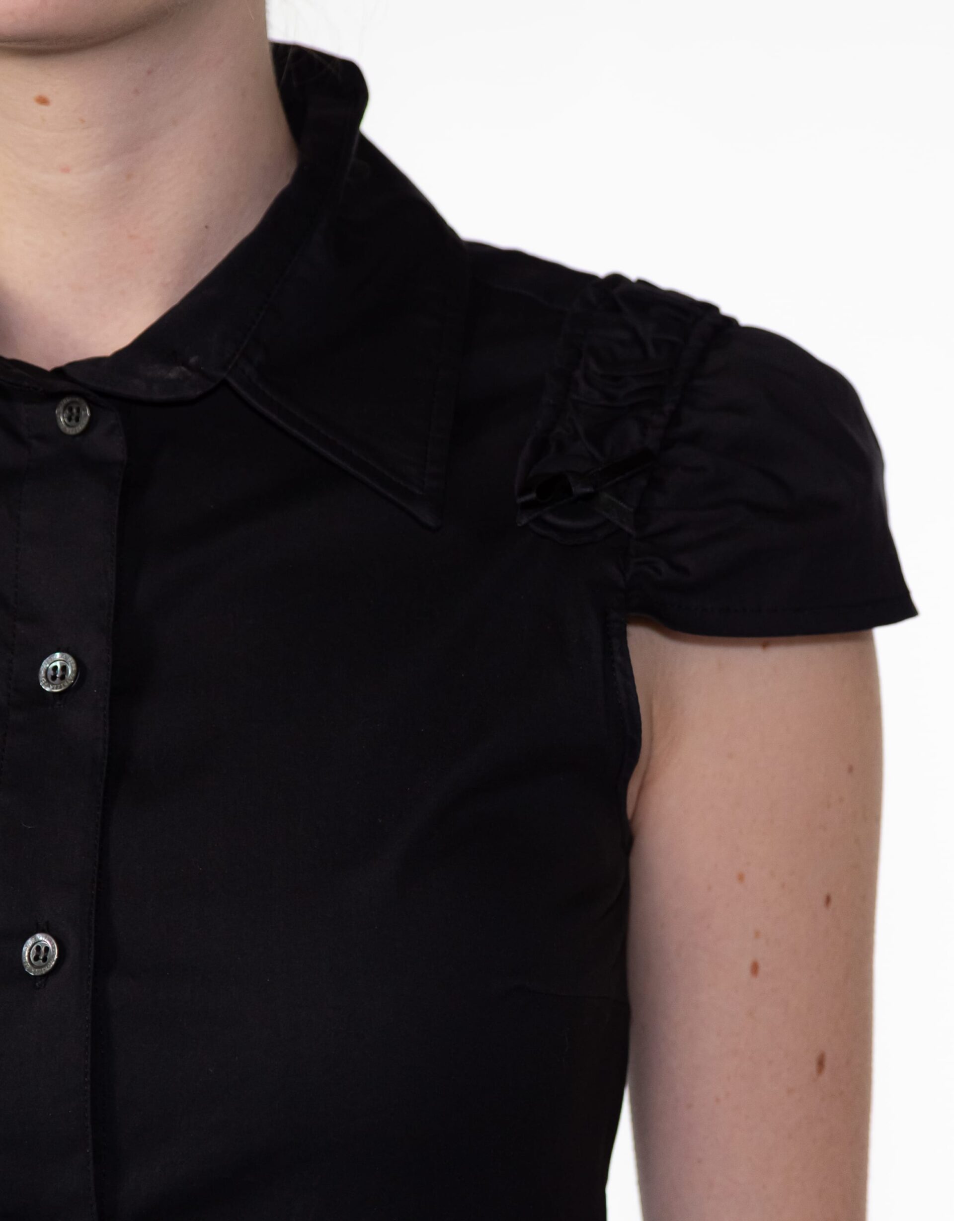 camicia a body a maniche corte con chiusura con 9 bottoni, applicazione ripresa sulle spalle, vestibilità attillata
