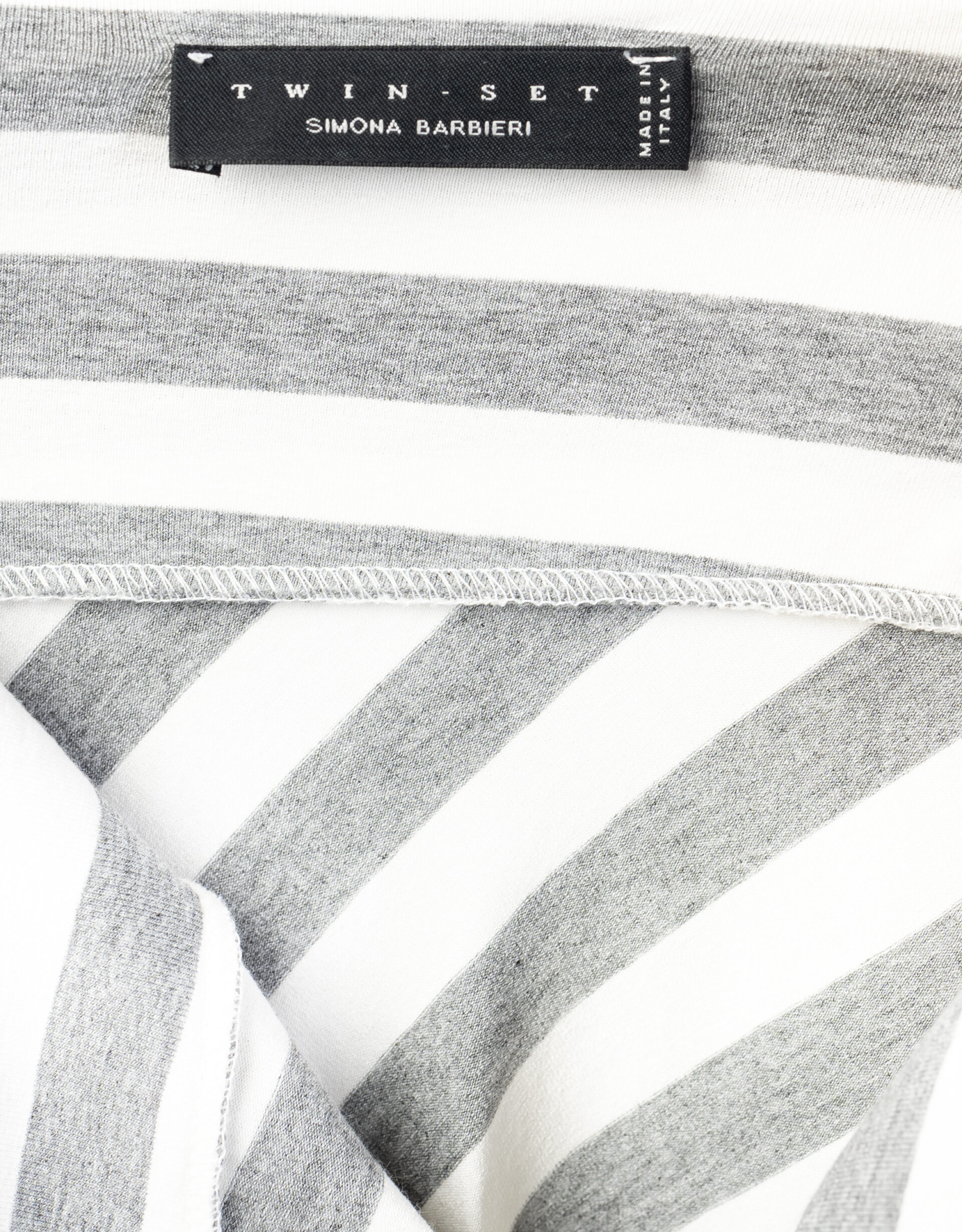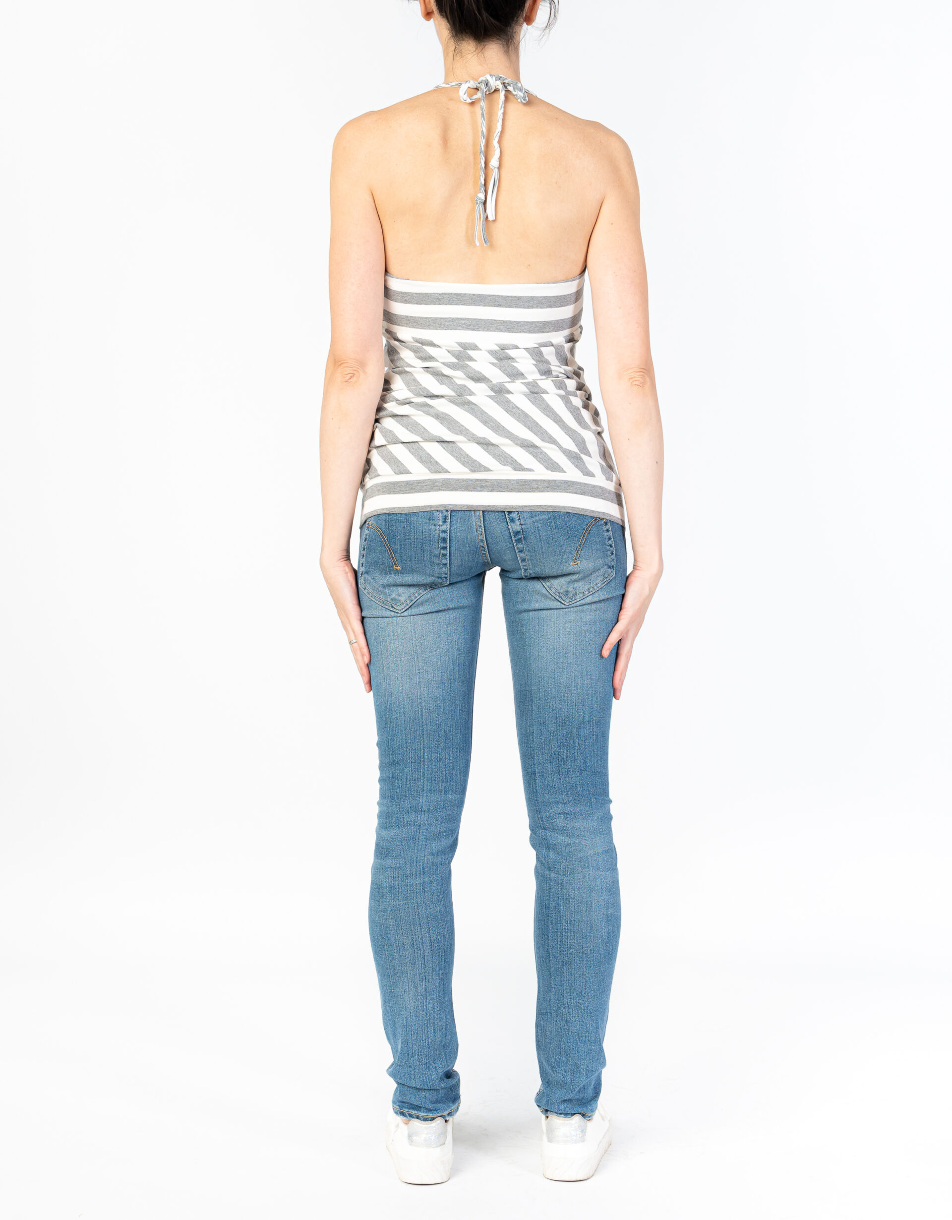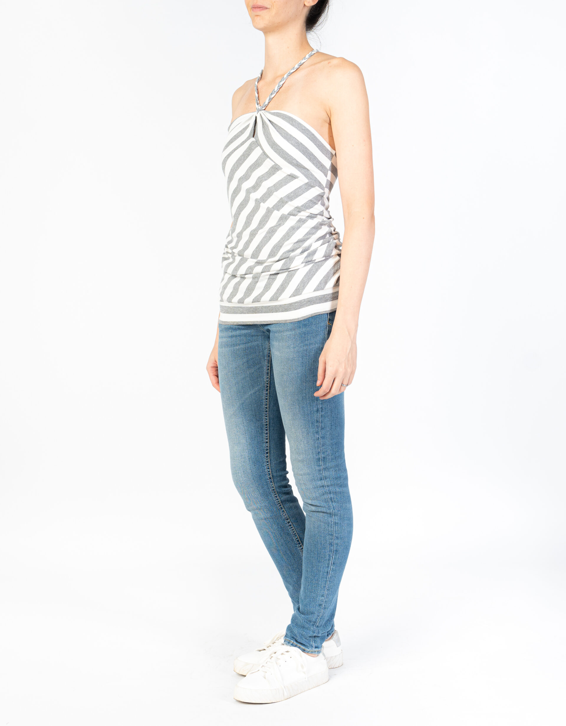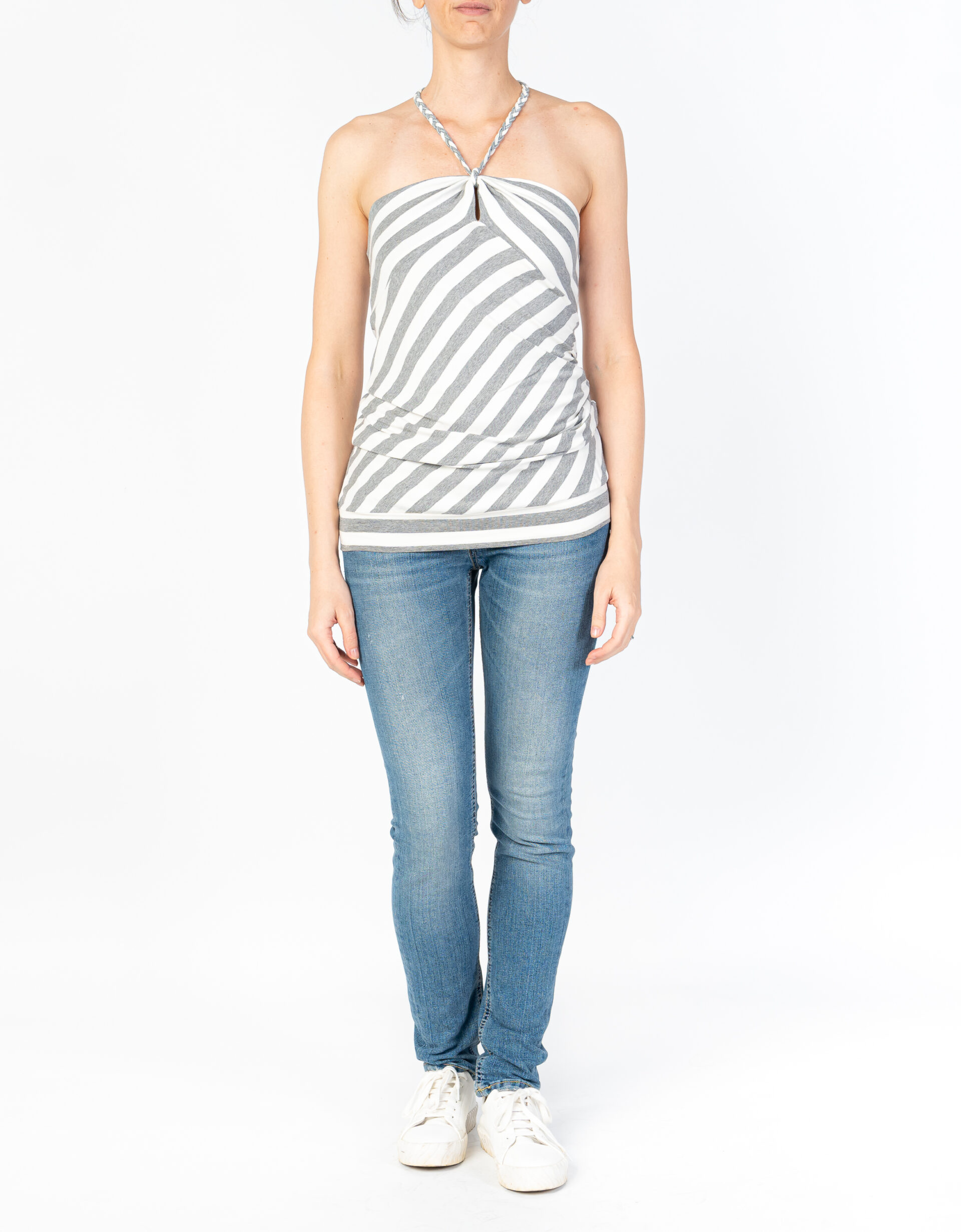 Top a righe trasversali, vestibilità boxy con polsino finale, senza maniche, con allacciatura all'americana a treccia
