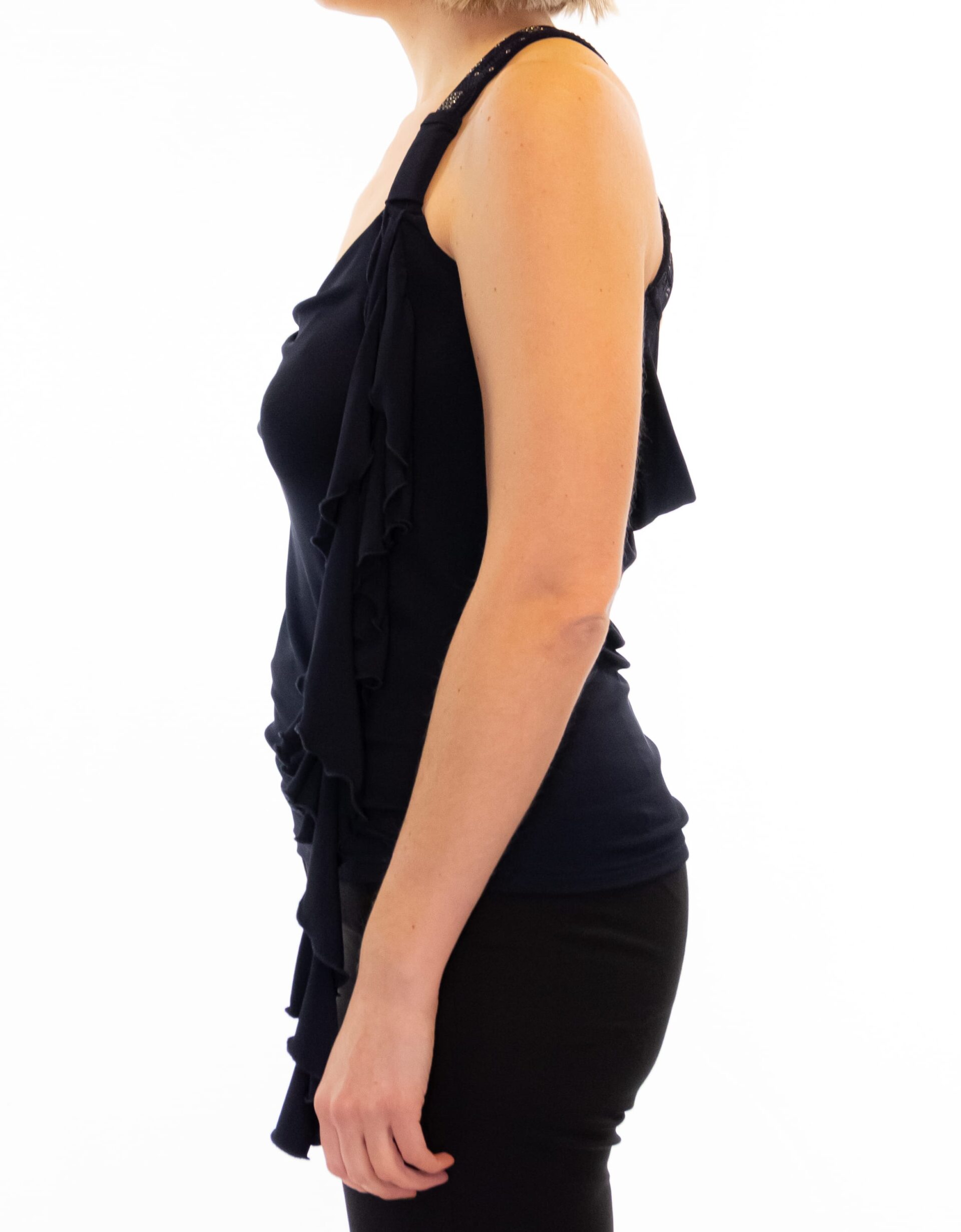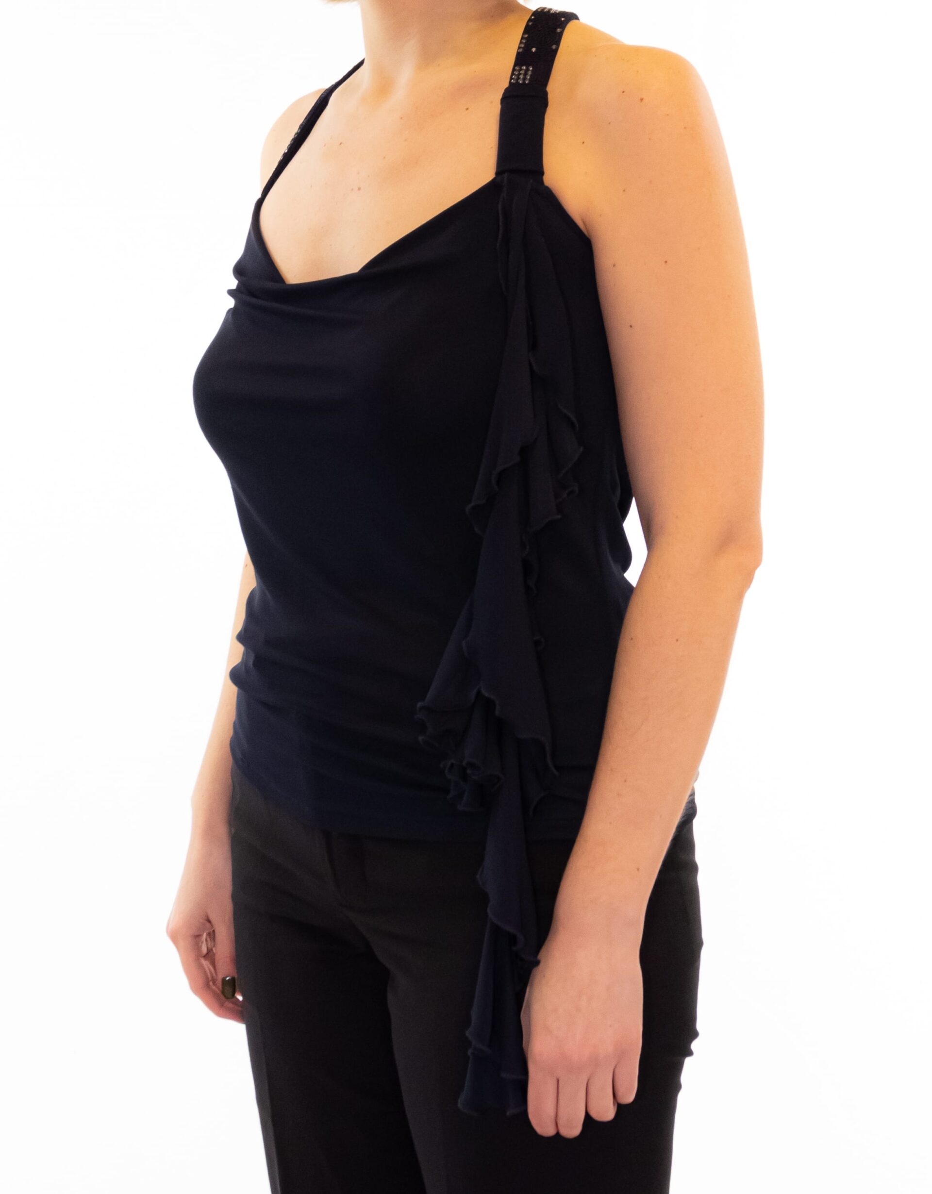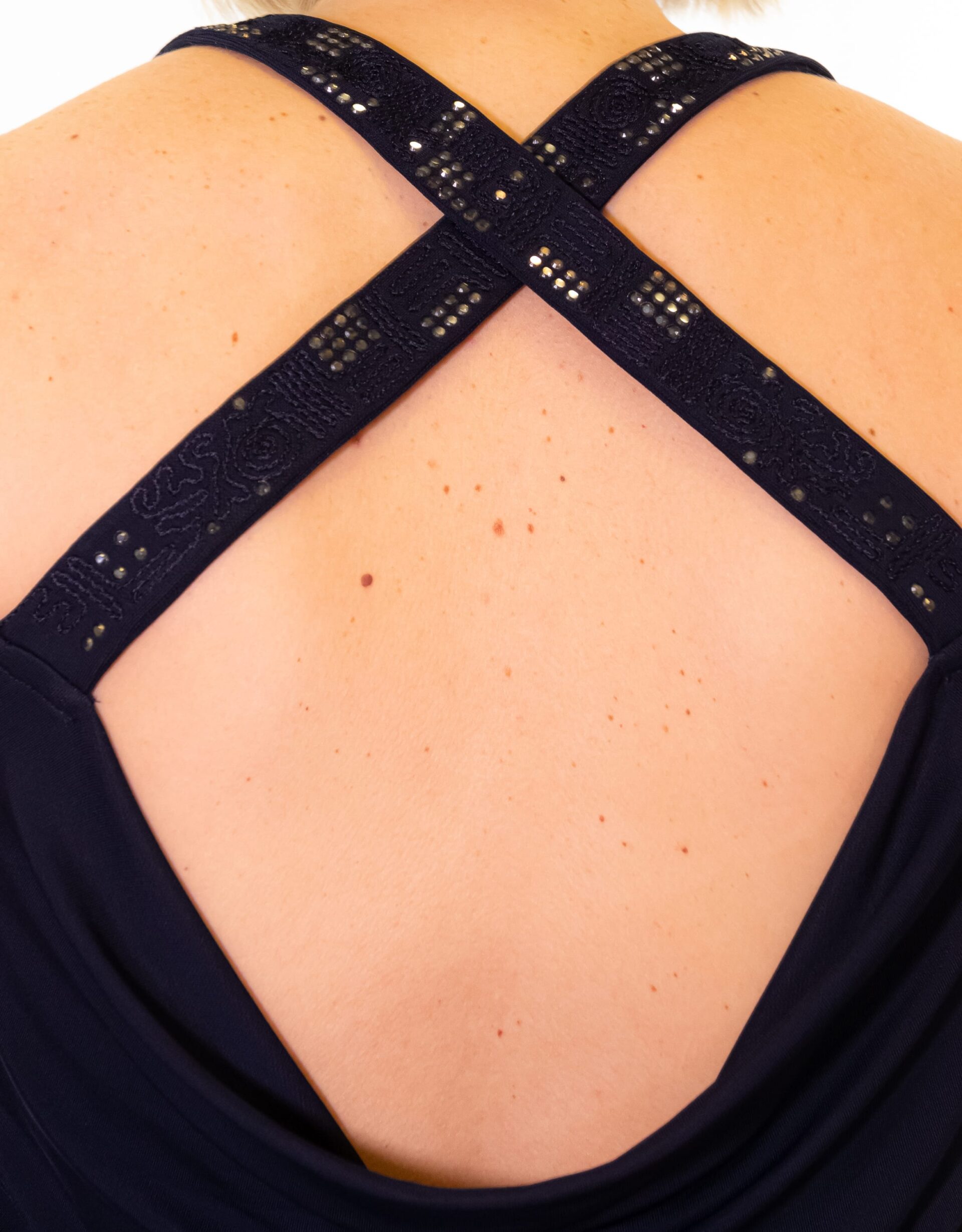 top senza maniche con spalline impreziosite da ricami e strass, ampio scollo a goccia sul dietro. Rouche laterale.