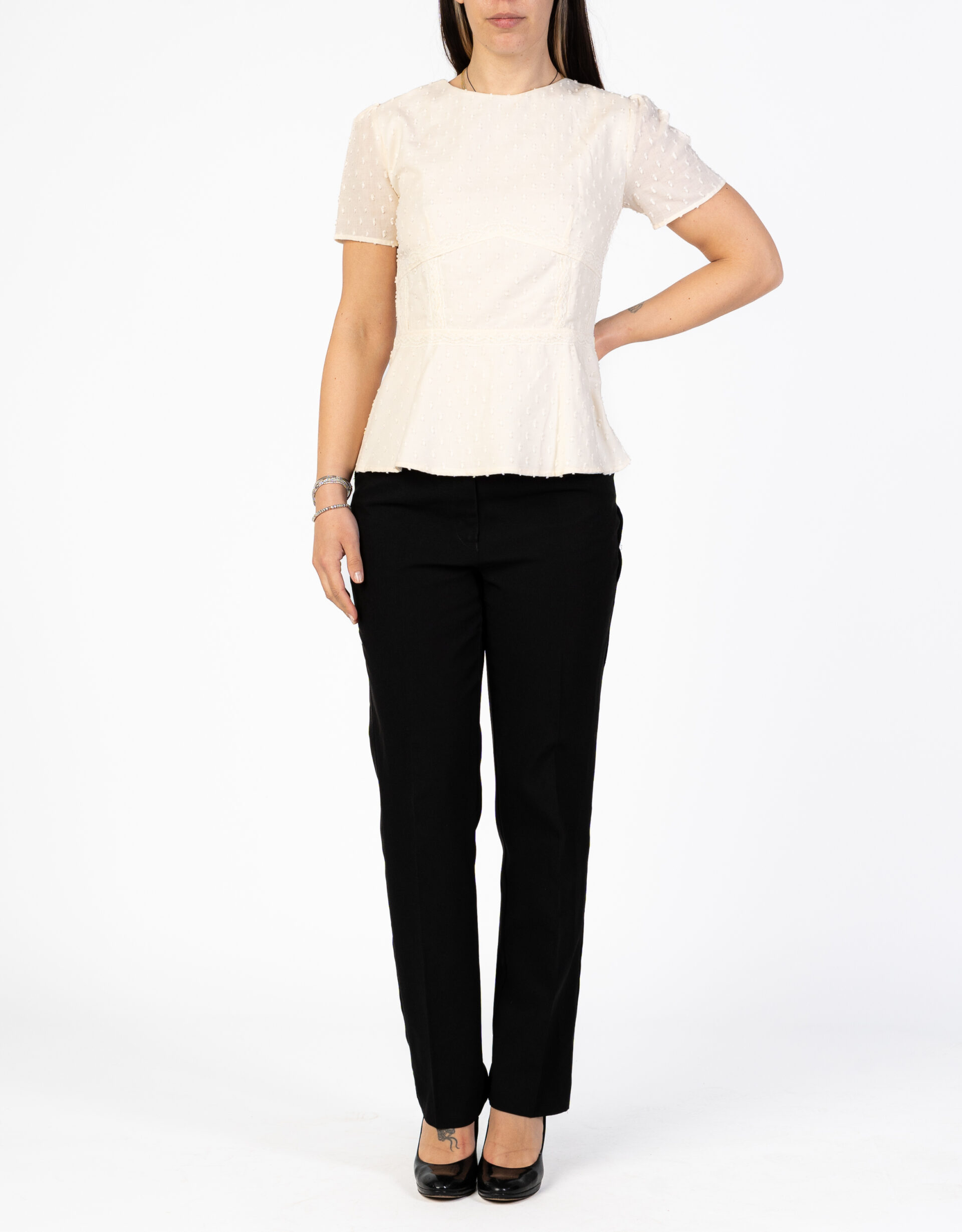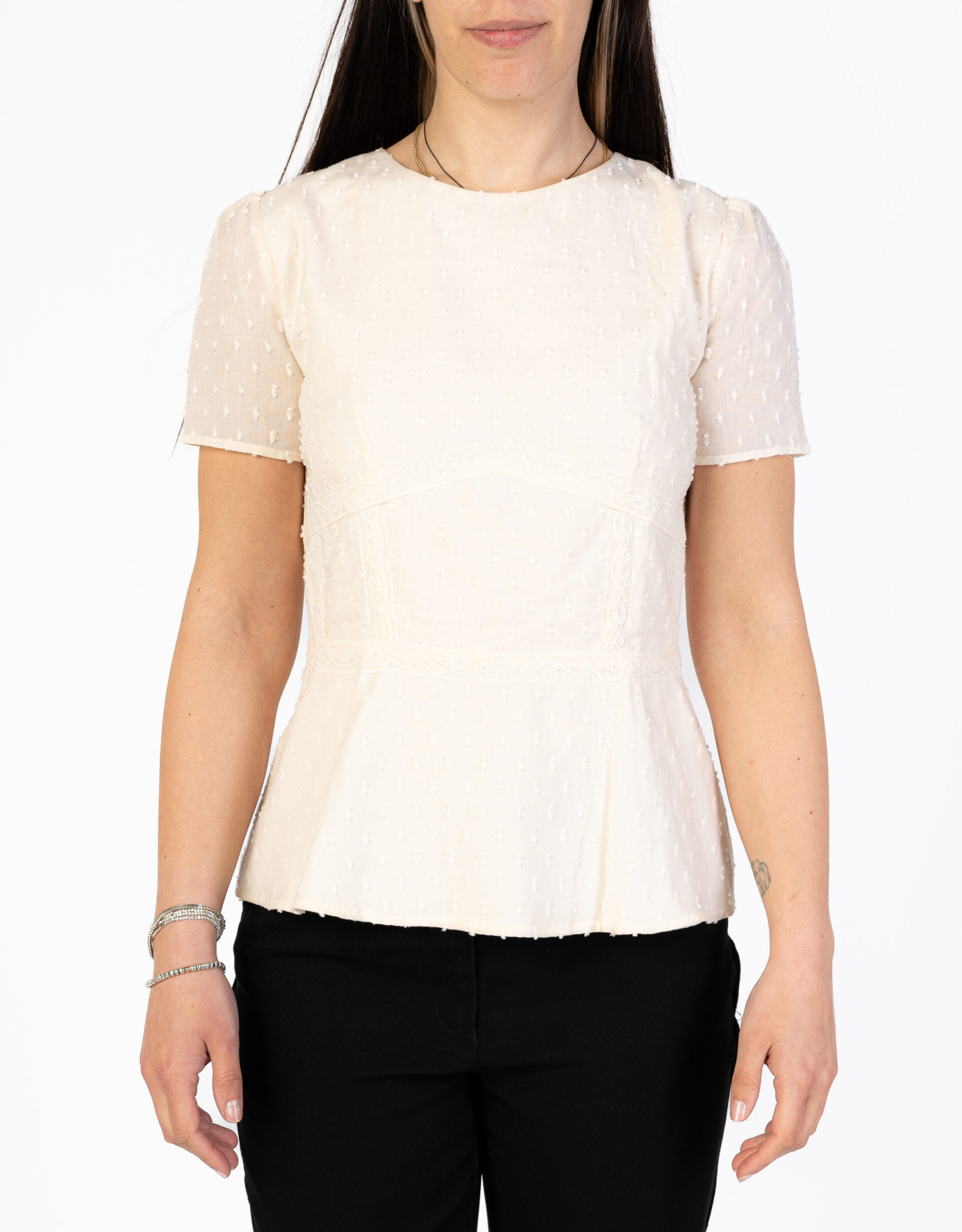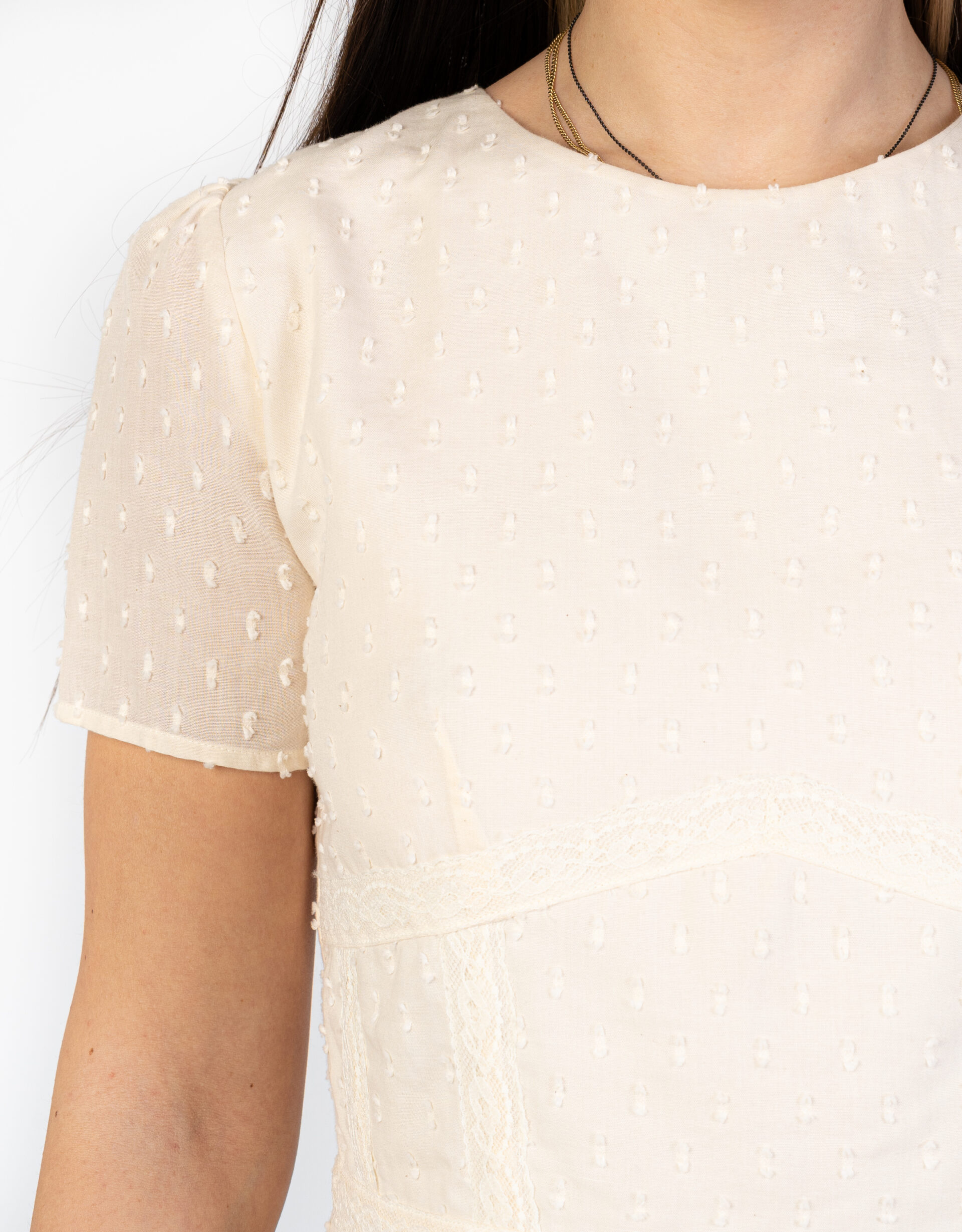 | Top a manica corta, tessuto lavorato con pois in rilievo, impreziosito da intarsi in pizzo. Chiusura con zip sul retro |