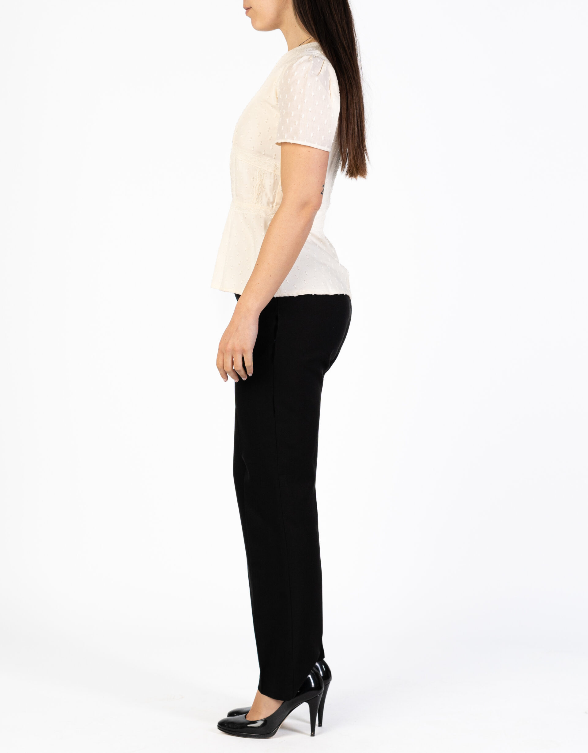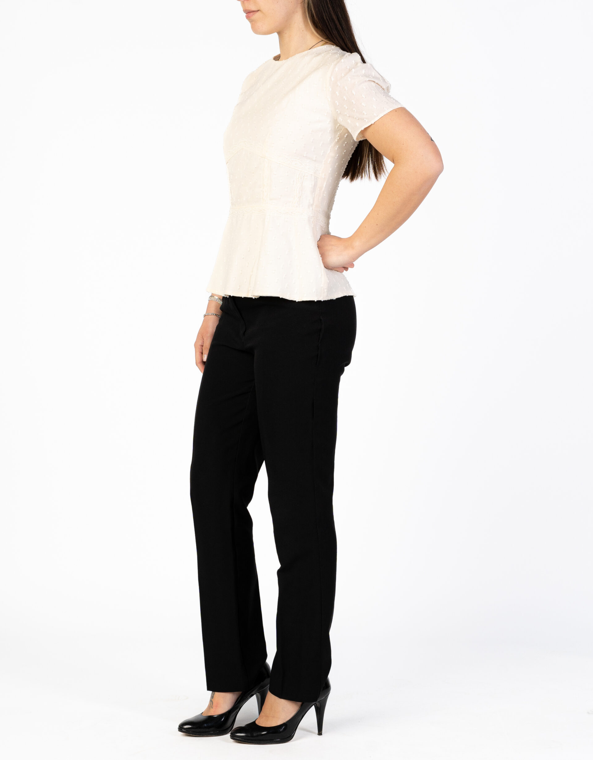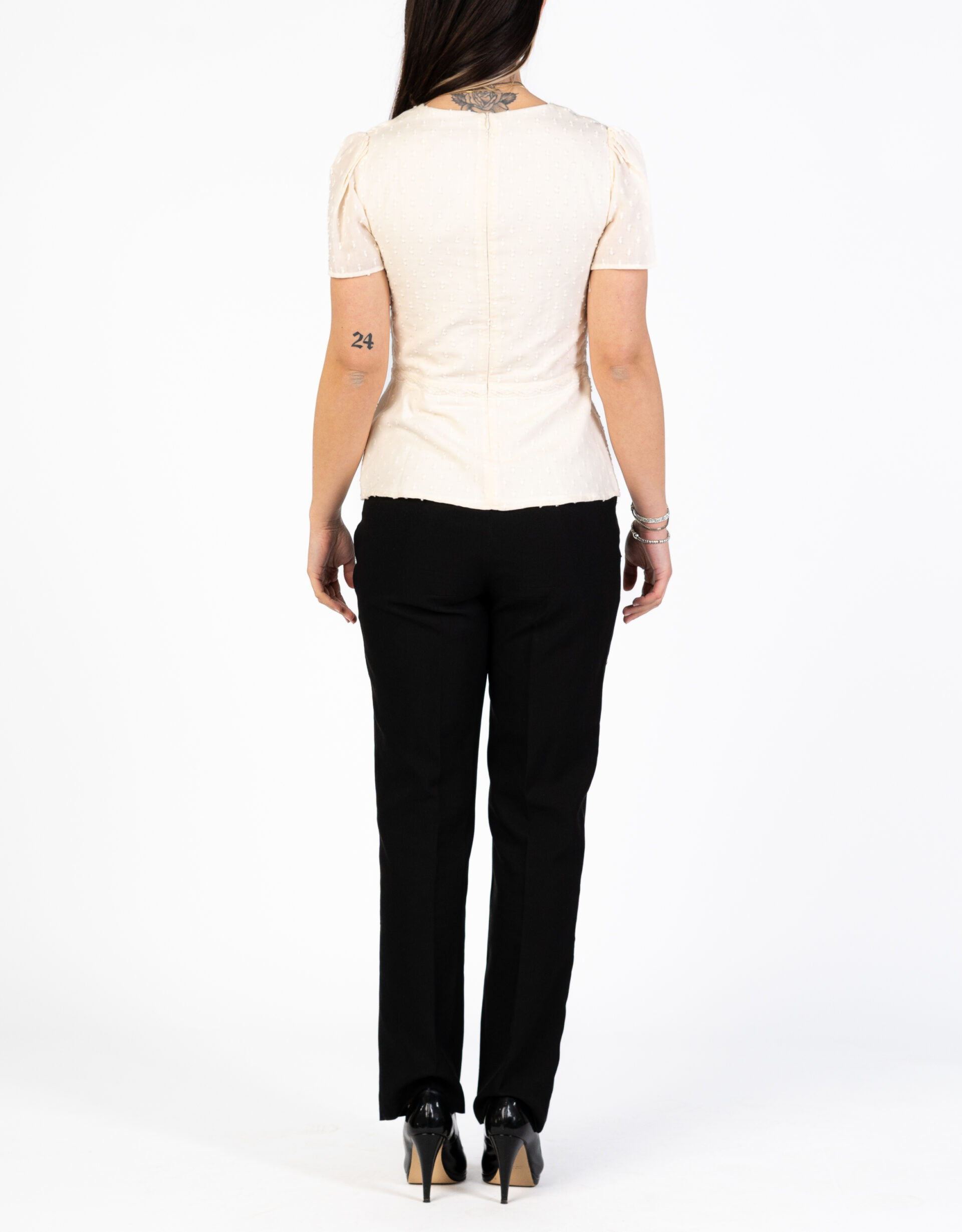 | Top a manica corta, tessuto lavorato con pois in rilievo, impreziosito da intarsi in pizzo. Chiusura con zip sul retro |