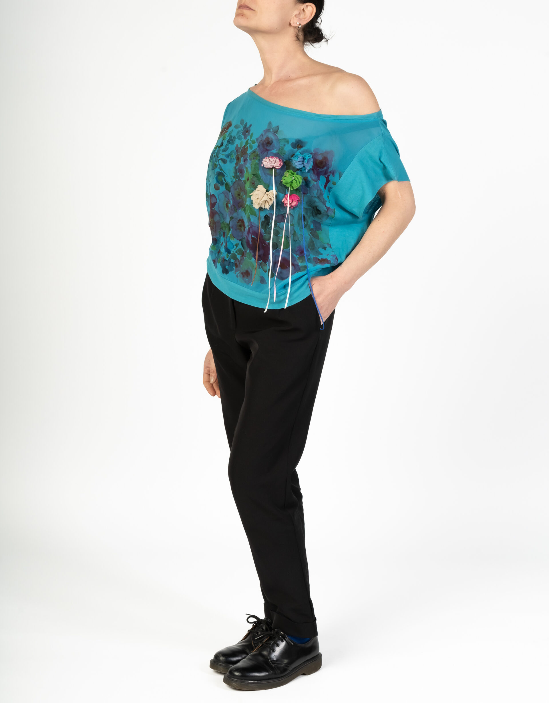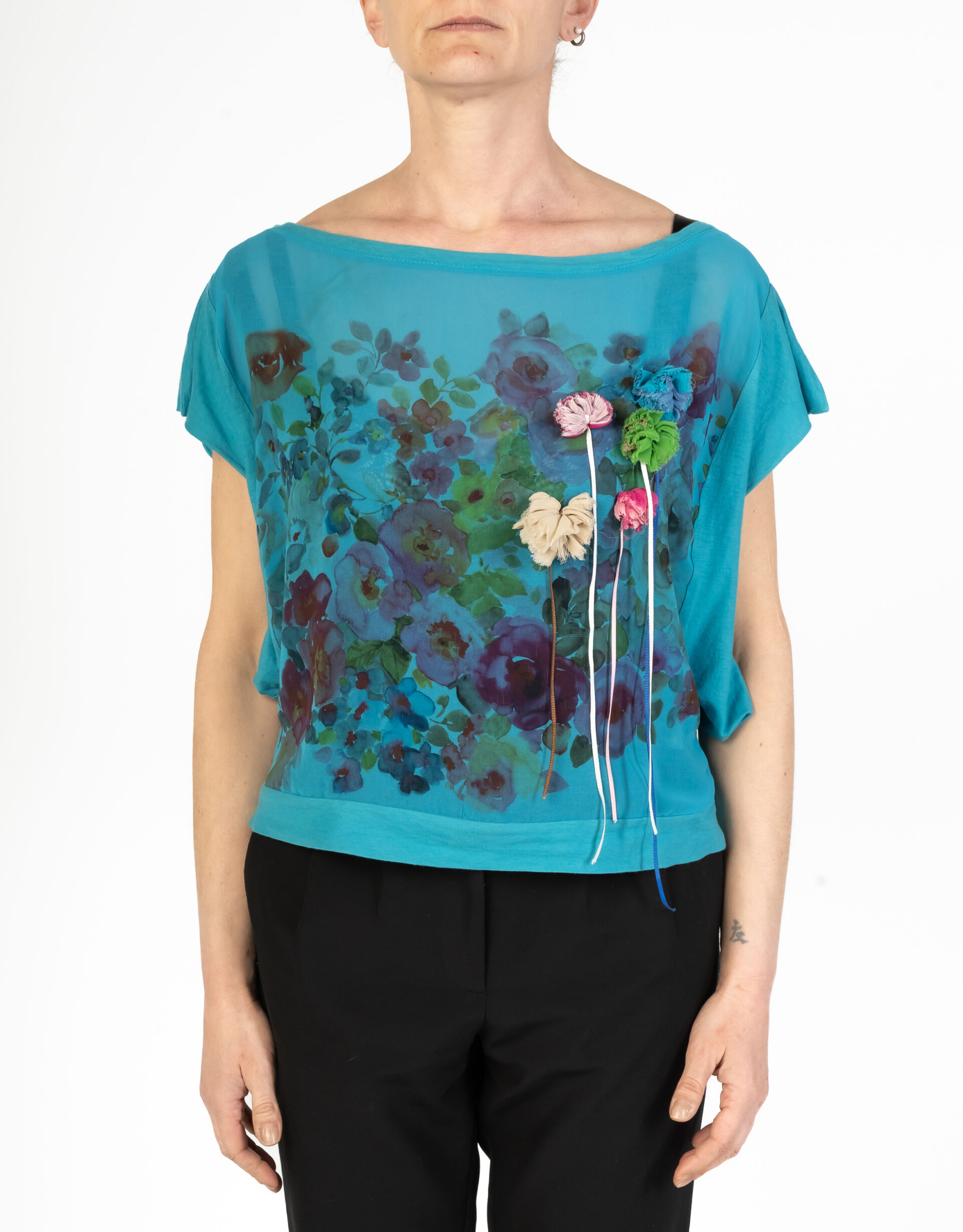 Top con maniche calate. Applicazioni floreali 3D