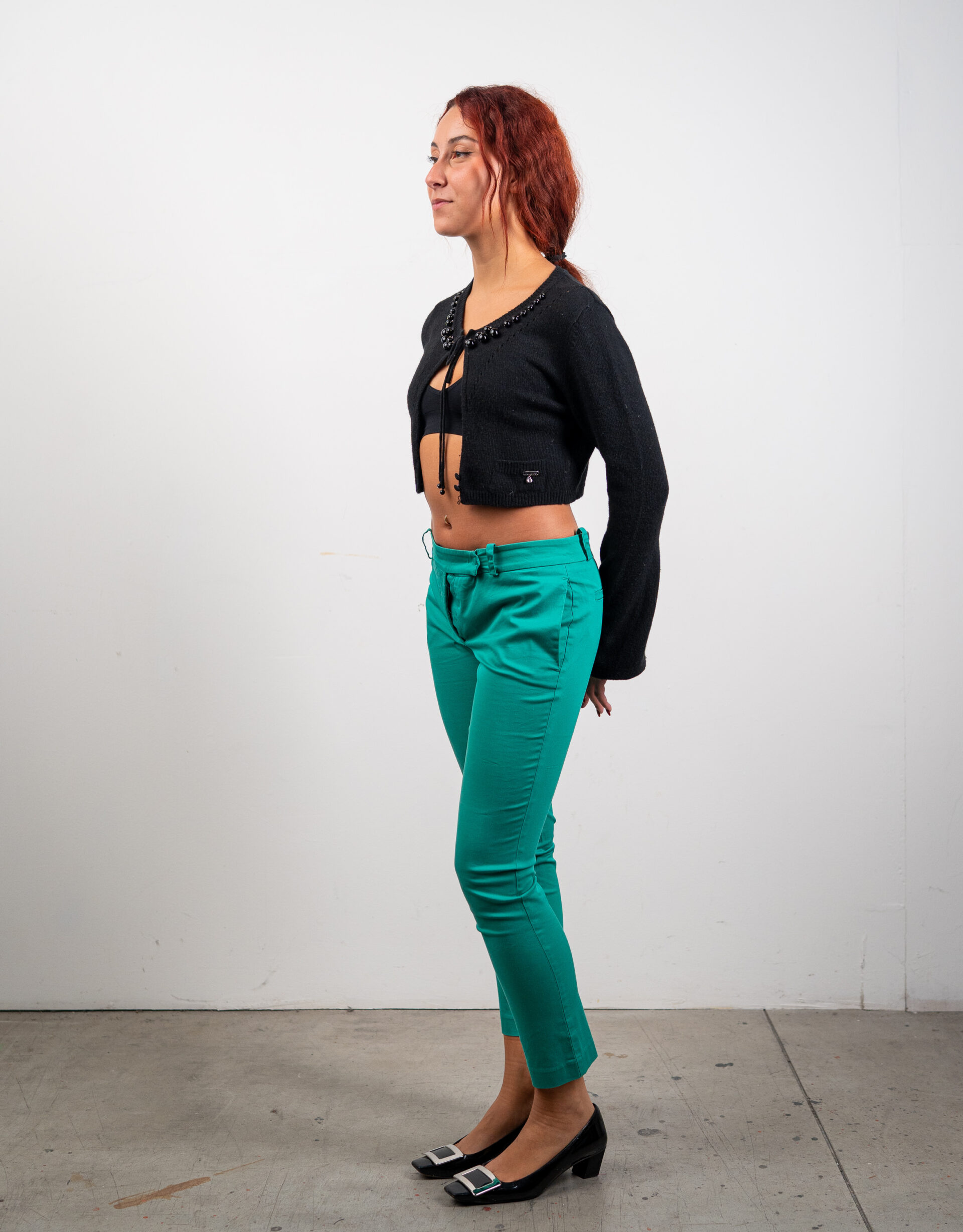 Pantalone a sigaretta con tasche anteriori e posteriori, dotato di passanti per cintura e chiusura frontale con bottoni e clip. Caratterizzato da un leggero effetto scolorito sulla parte anteriore sinistra, per un look contemporaneo e distintivo. Ideale per outfit casual-chic e versatili.