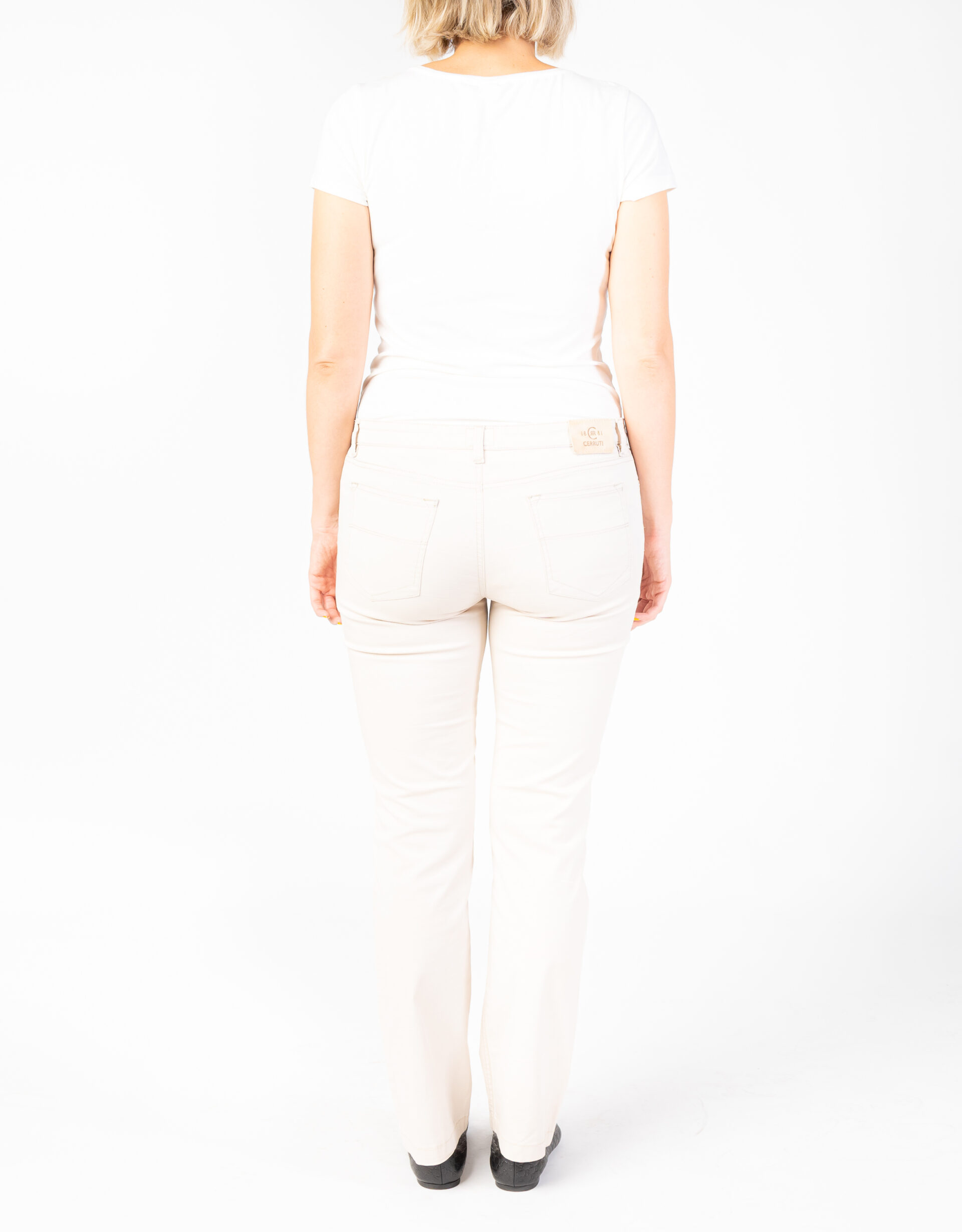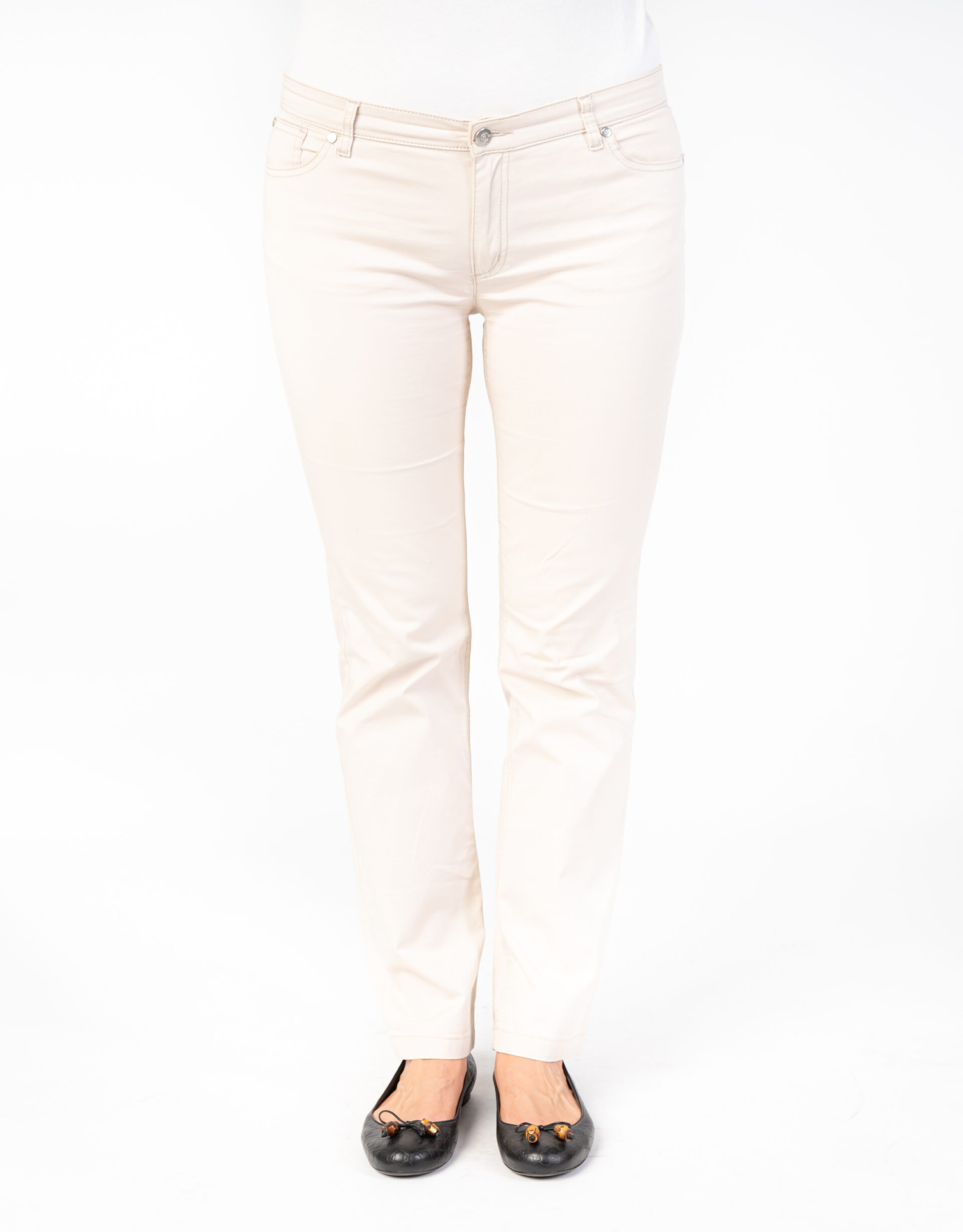 Pantalone modello jeans color avorio, con chiusura frontale con zip e bottone, passanti e due tasche anteriori e due posteriori. Perfetto per un look casual-chic e versatile.