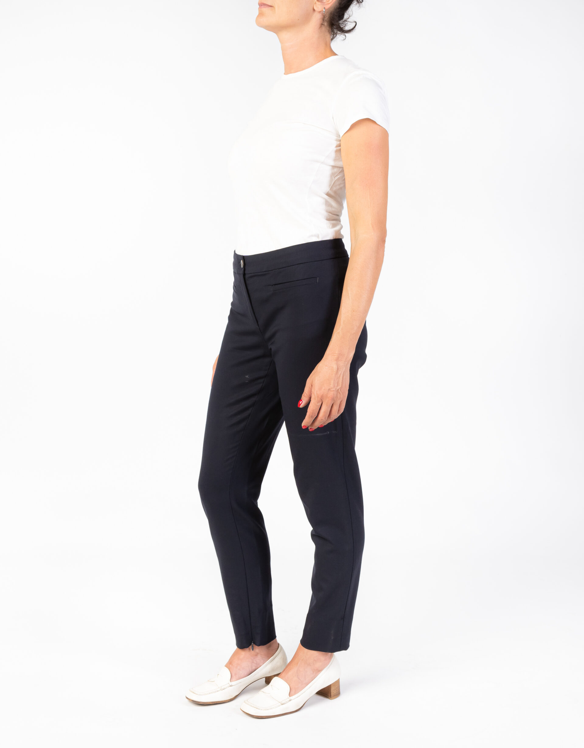 Pantalone Max Mara in lana vergine color blu notte, modello classico con due tasche anteriori e chiusura frontale con zip e bottone. Dotato di zip interne alle caviglie. Un capo elegante e versatile, ideale per look raffinati e contemporanei.