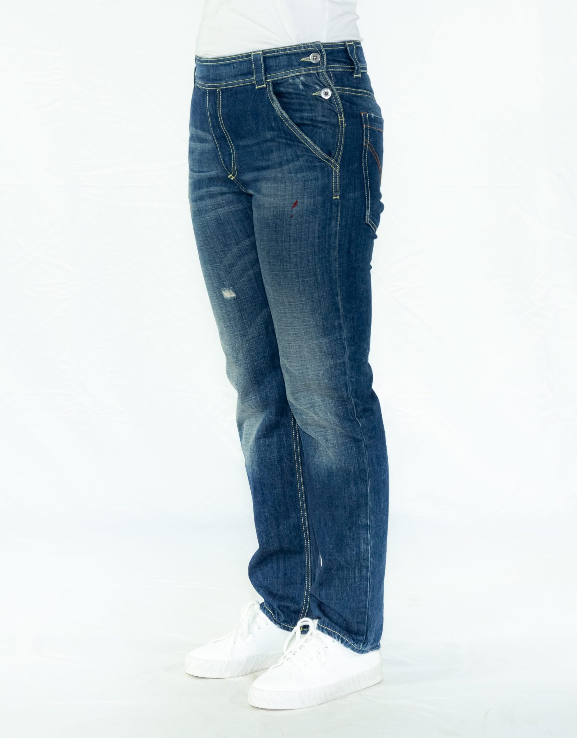 Jeans lavaggio scuro con cuciture gialle, chiusra ambo i lati con doppio bottone