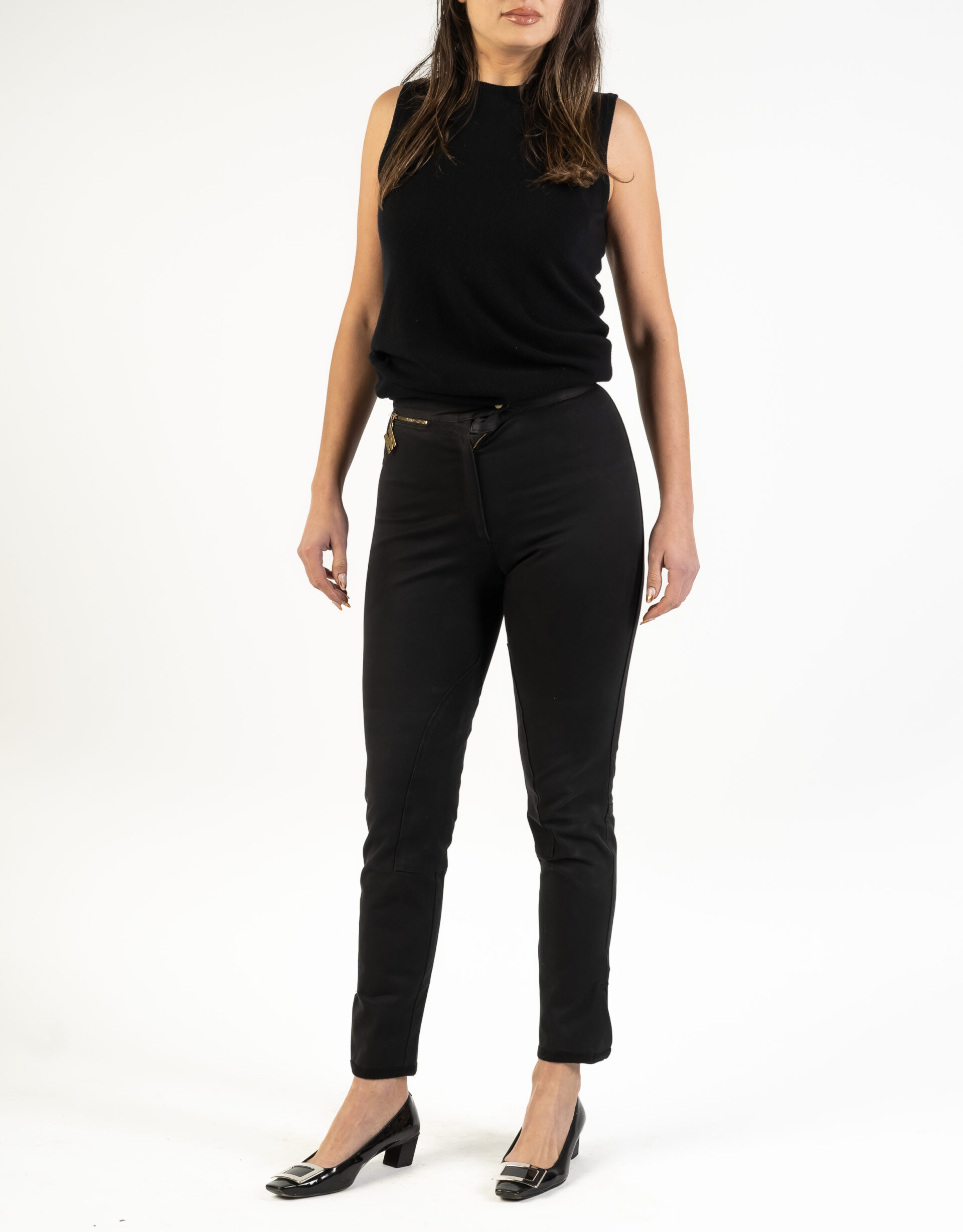 Pantalone nero stretch tipo cavallerizza. Chiusura alla caviglia a strappo.