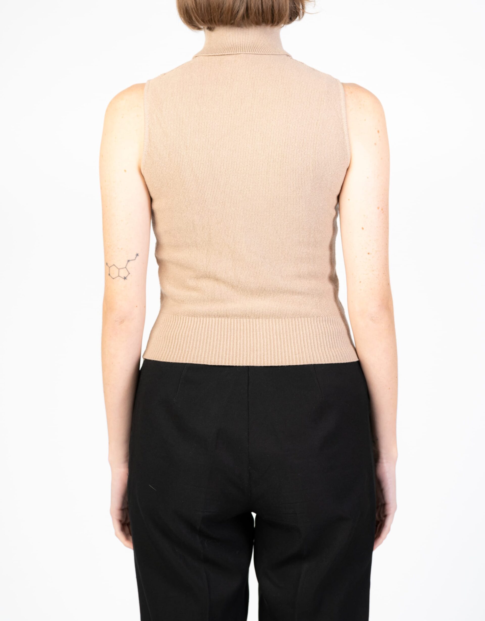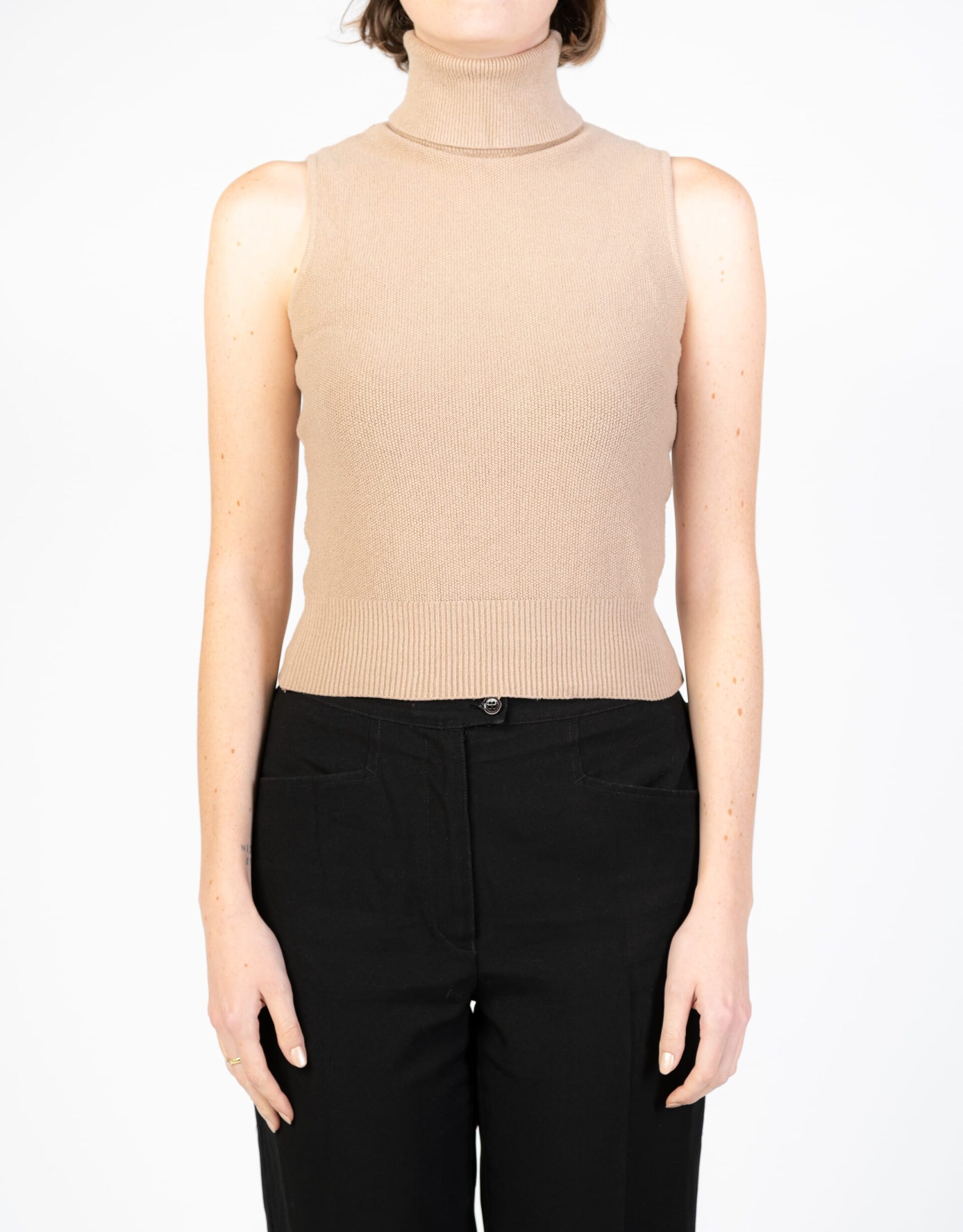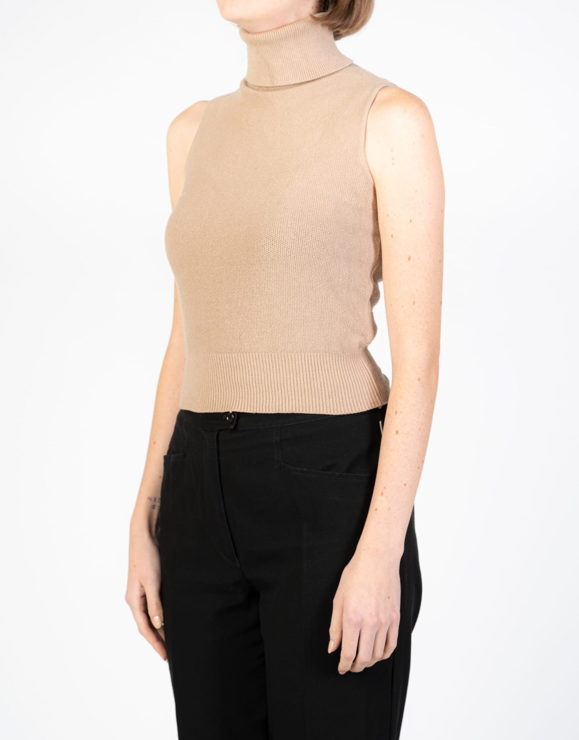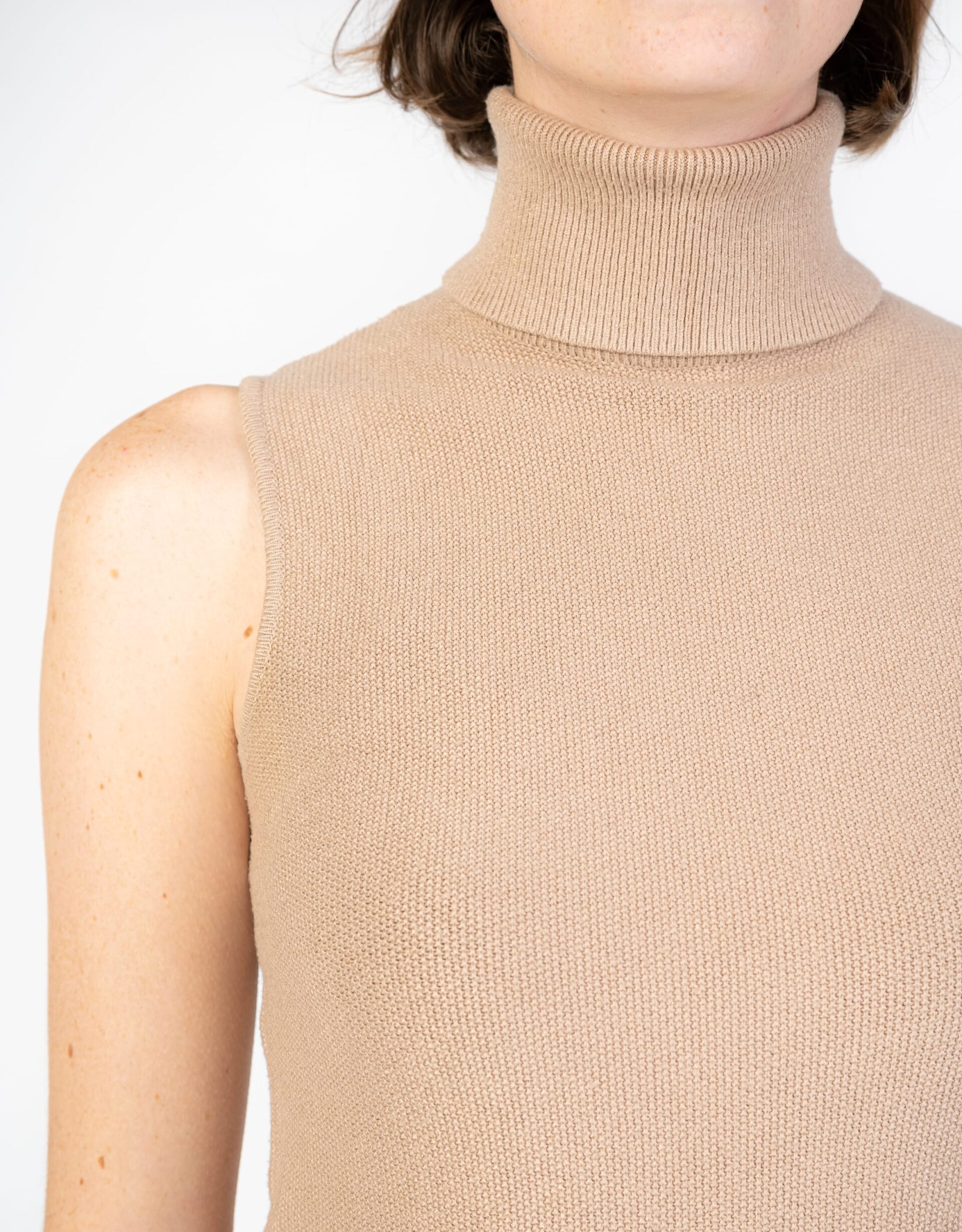 Maglioncino beige smanicato e a collo alto di Max e Co. Un capo semplice e passepartout da indossare tutto l'anno con diverse combinazioni di stile.
