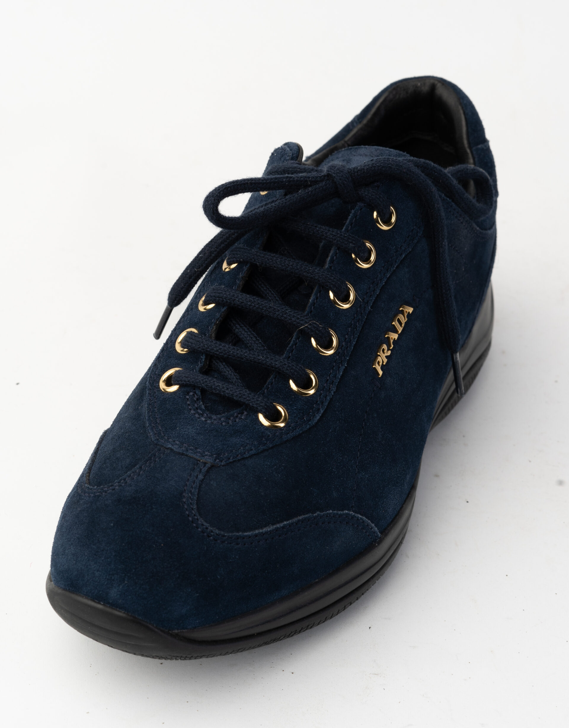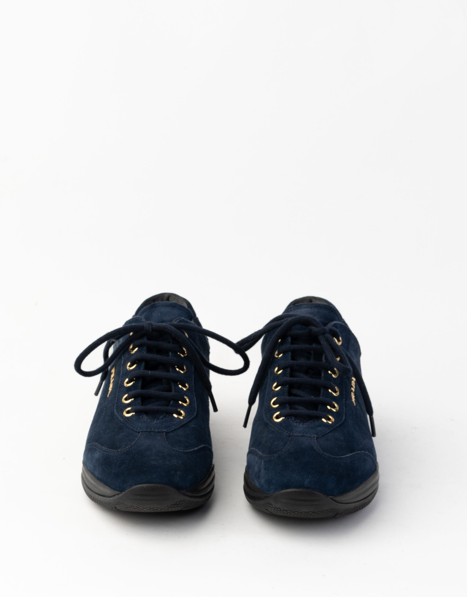 Sneakers in camoscio oltremare con occhielli e logo oro, punta tonda. Fodera in pelle nera. Suola in gomma nera con logo rosso.