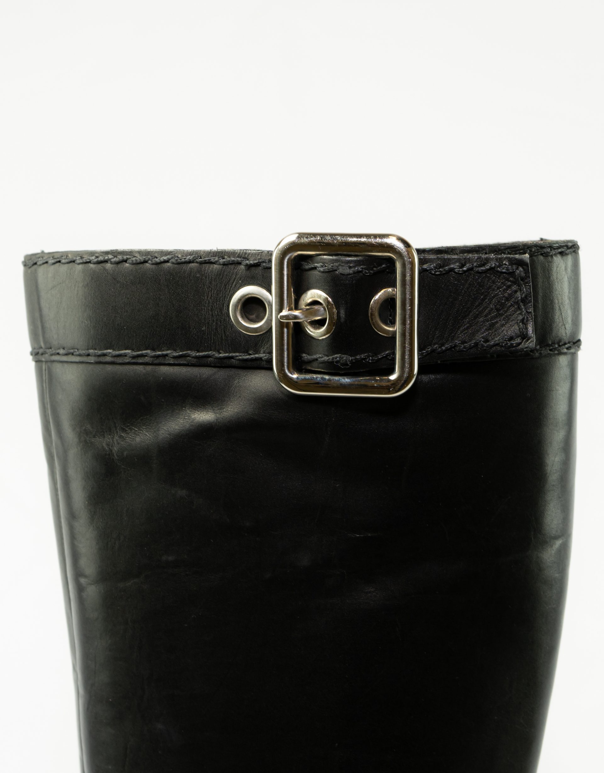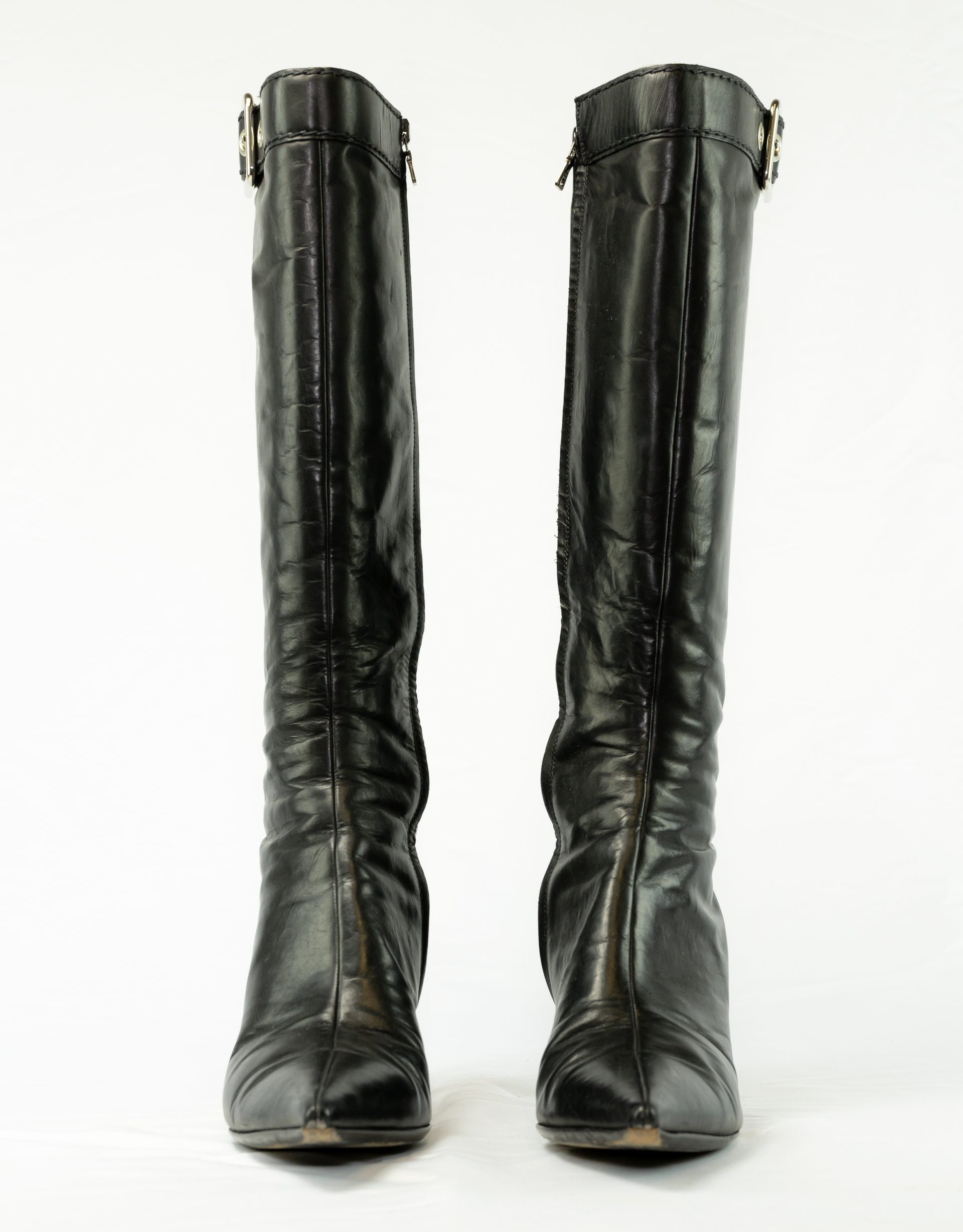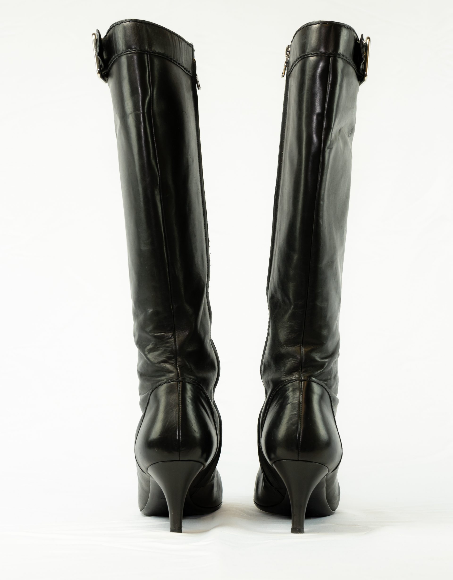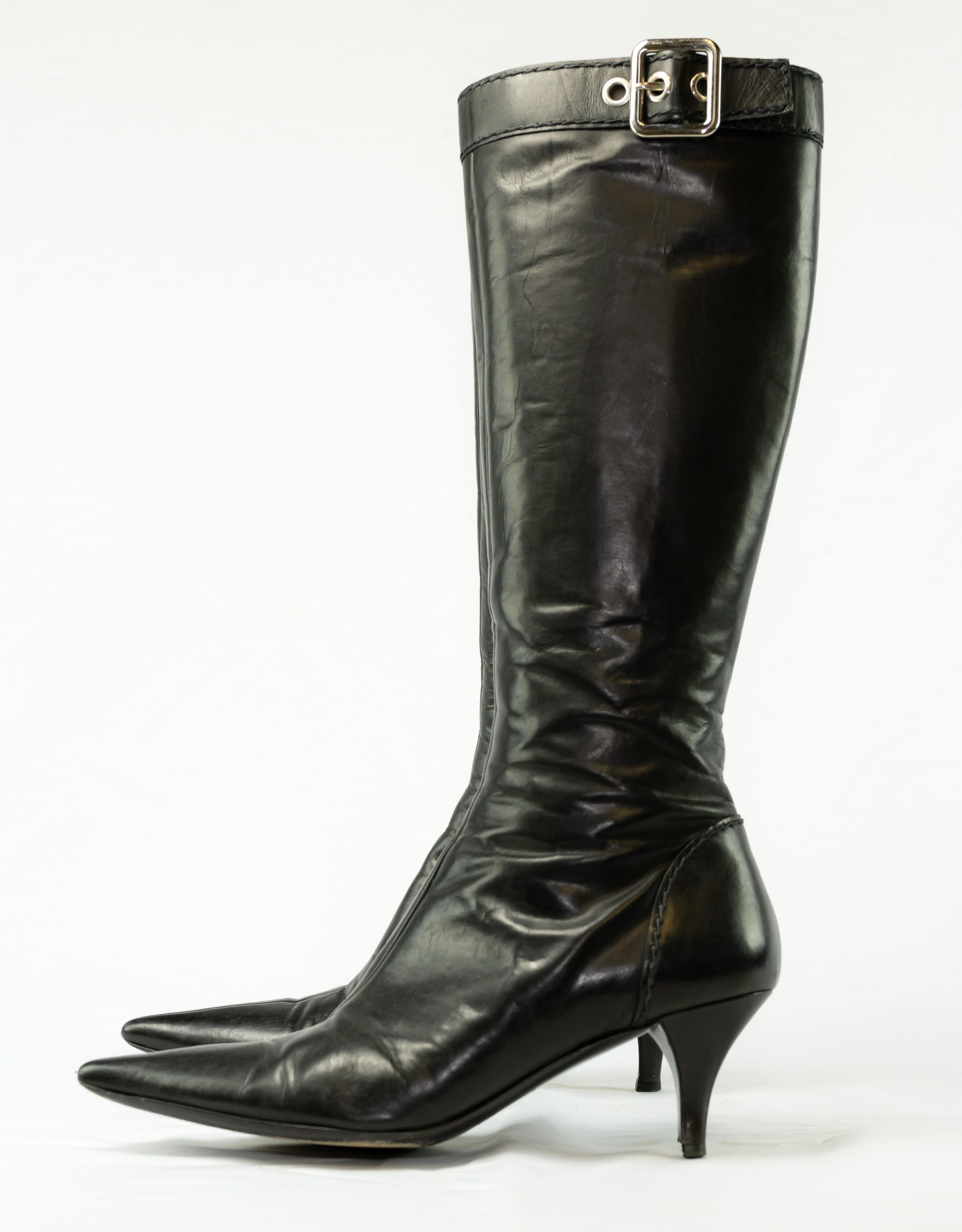 Stivale in morbida pelle nera di Prada con maxi fibbia argentata e tacco 7 cm. Un design raffinato e deciso per uno stile moderno e contemporaneo che non rinuncia ad eleganza e femminilità.