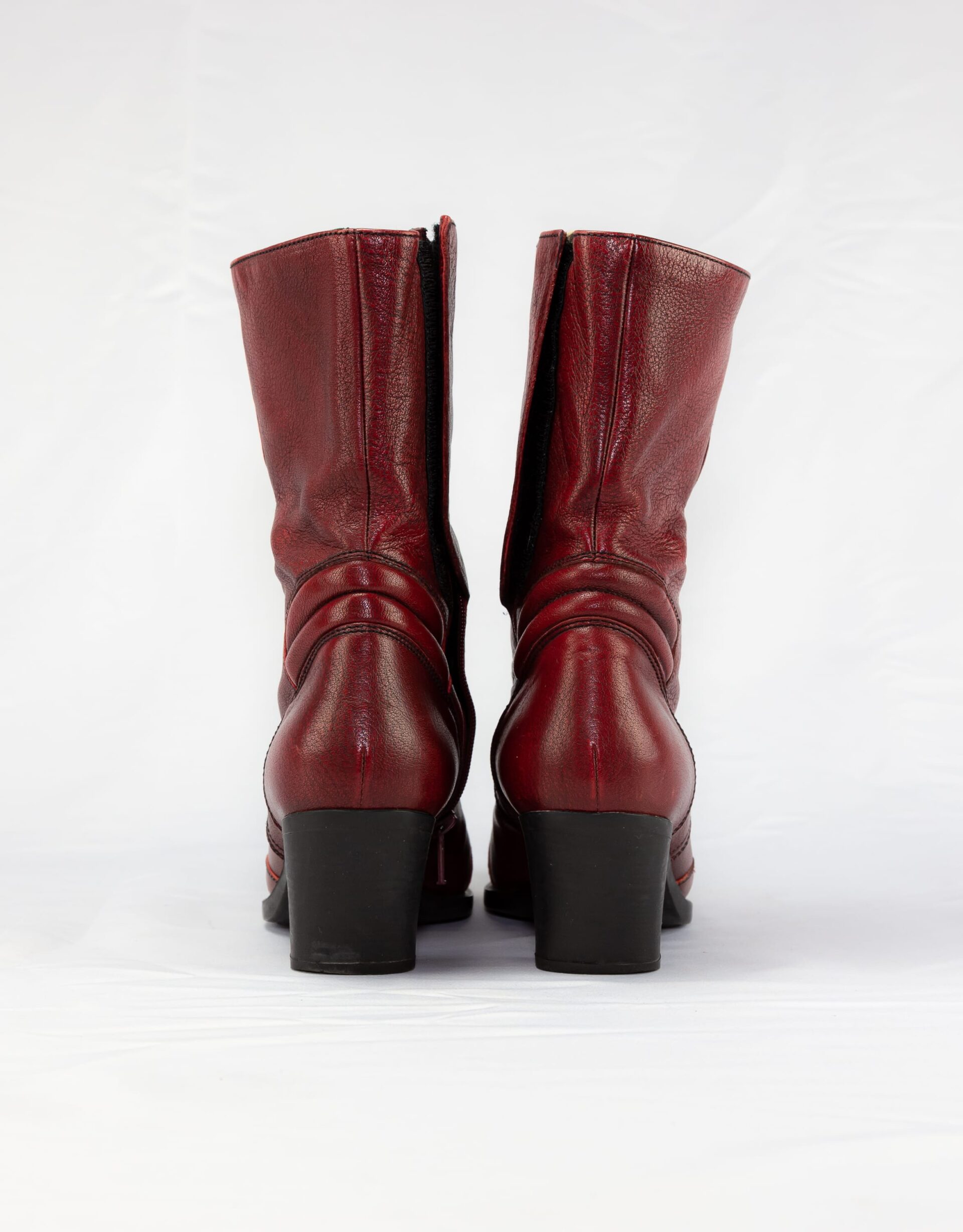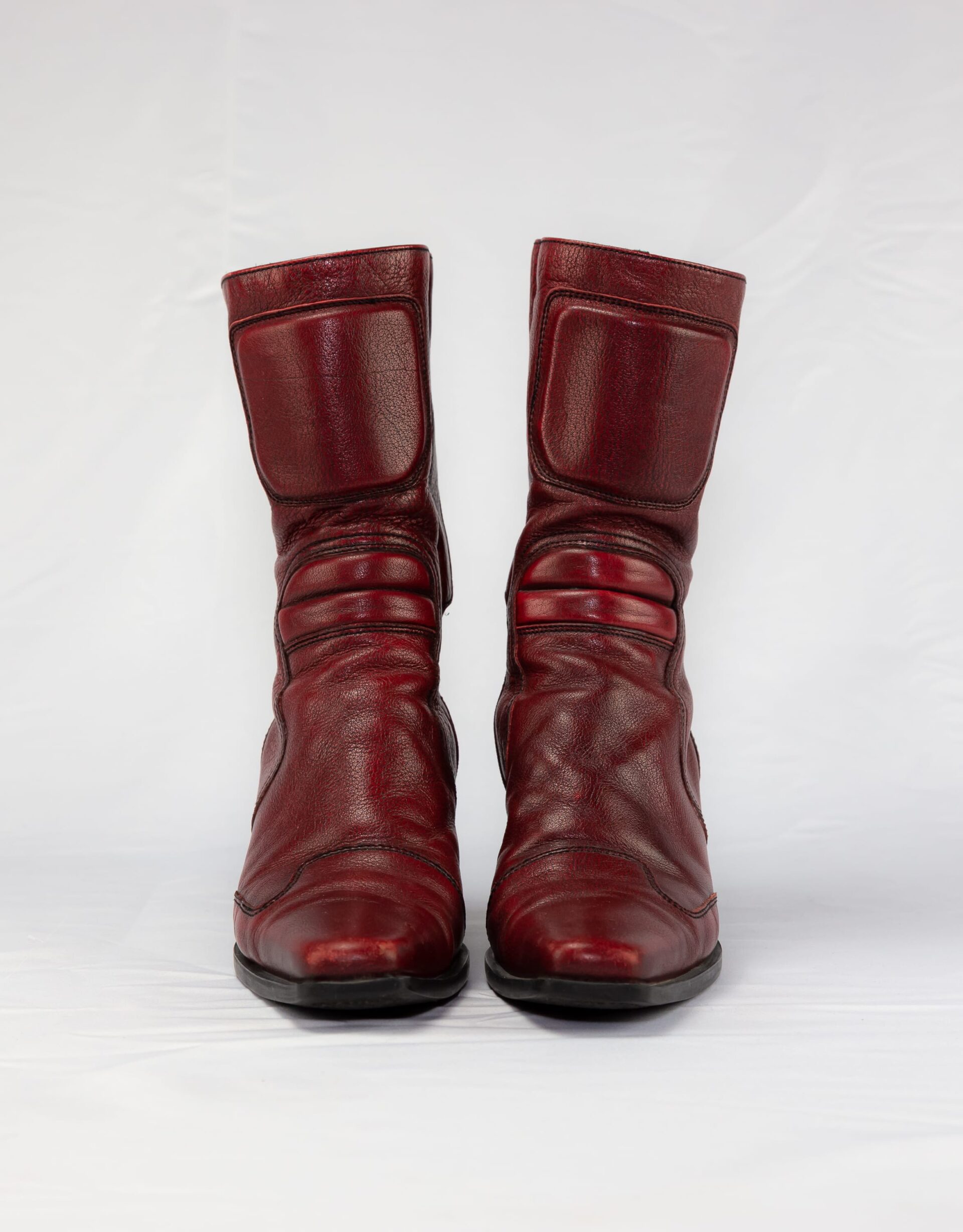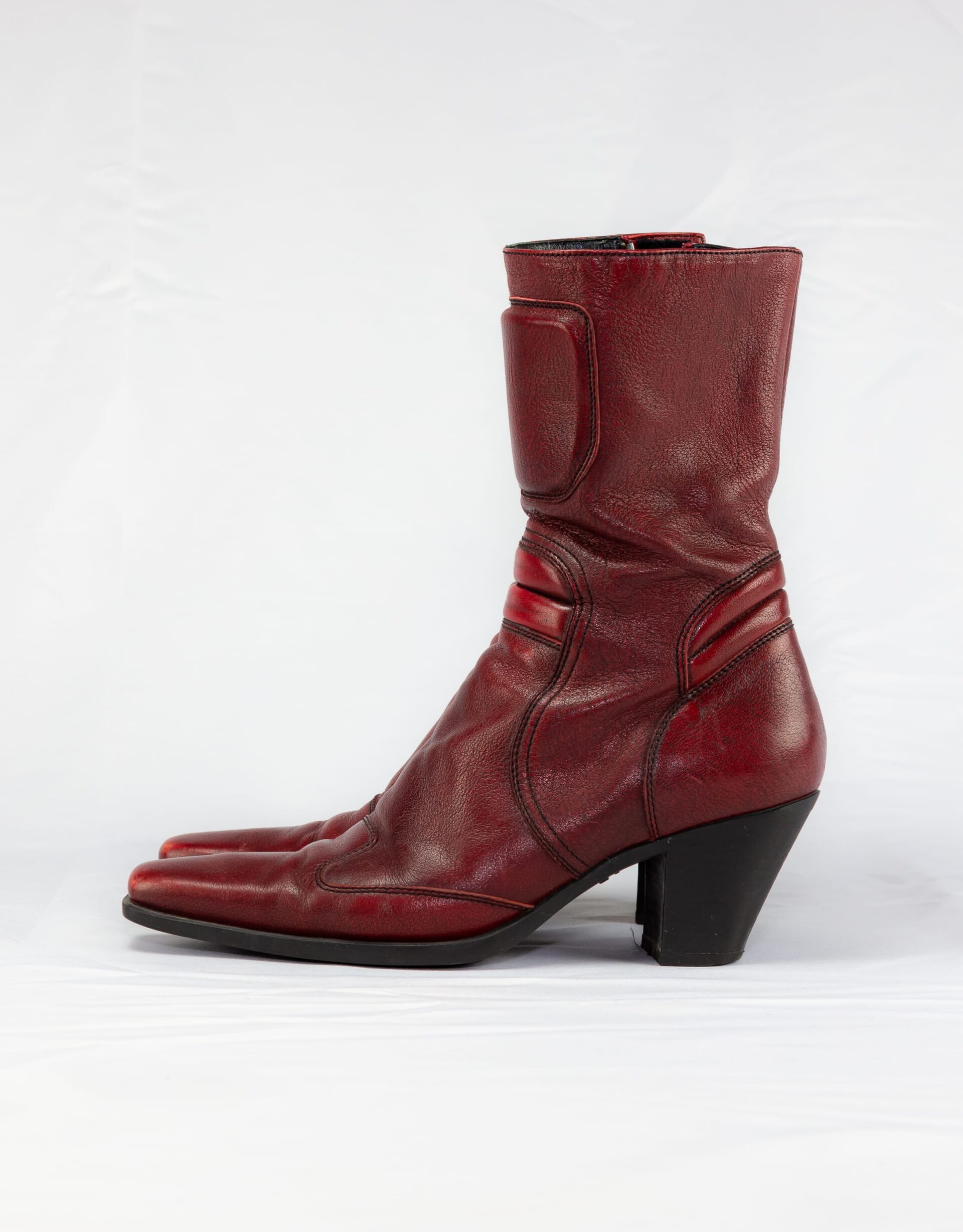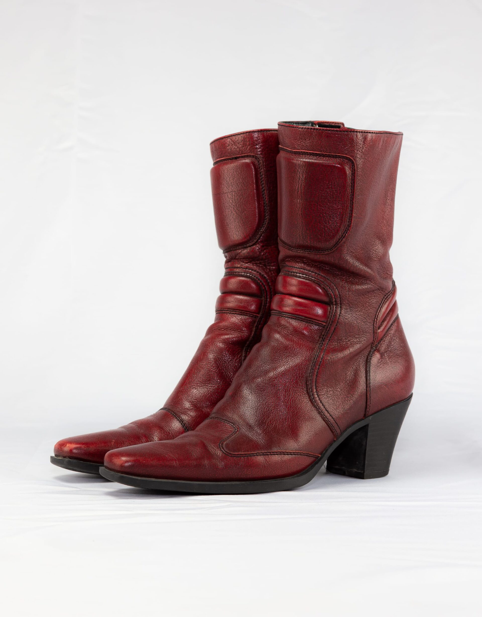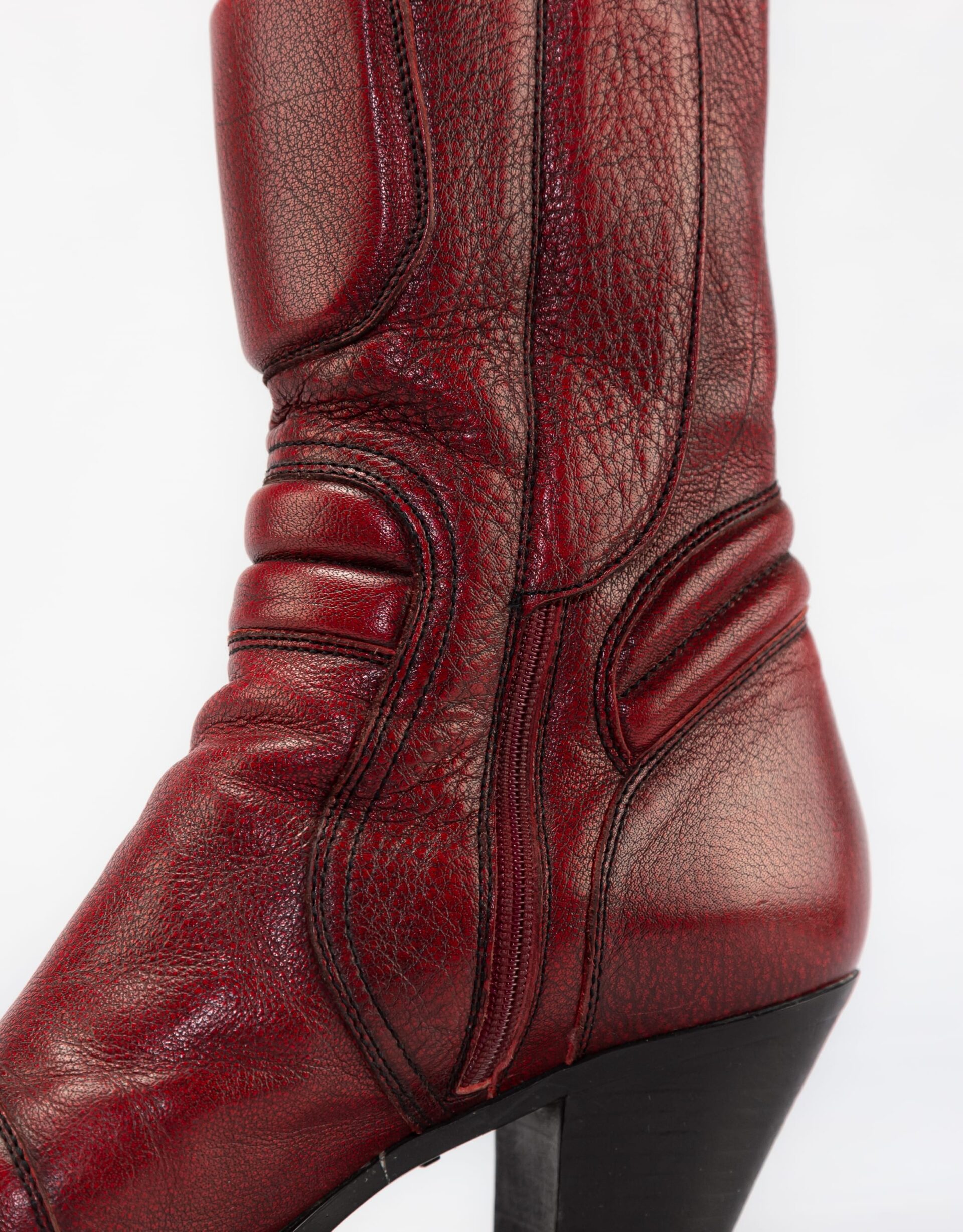 Stivale in pelle carminio con inserti imbottiti e cuciture a contrasto. Stile texano con cerniera nel lato interno, punta quadrata. Fodera in pelle nera. Tacco di h 60 mm e suola in gomma con logo impresso.